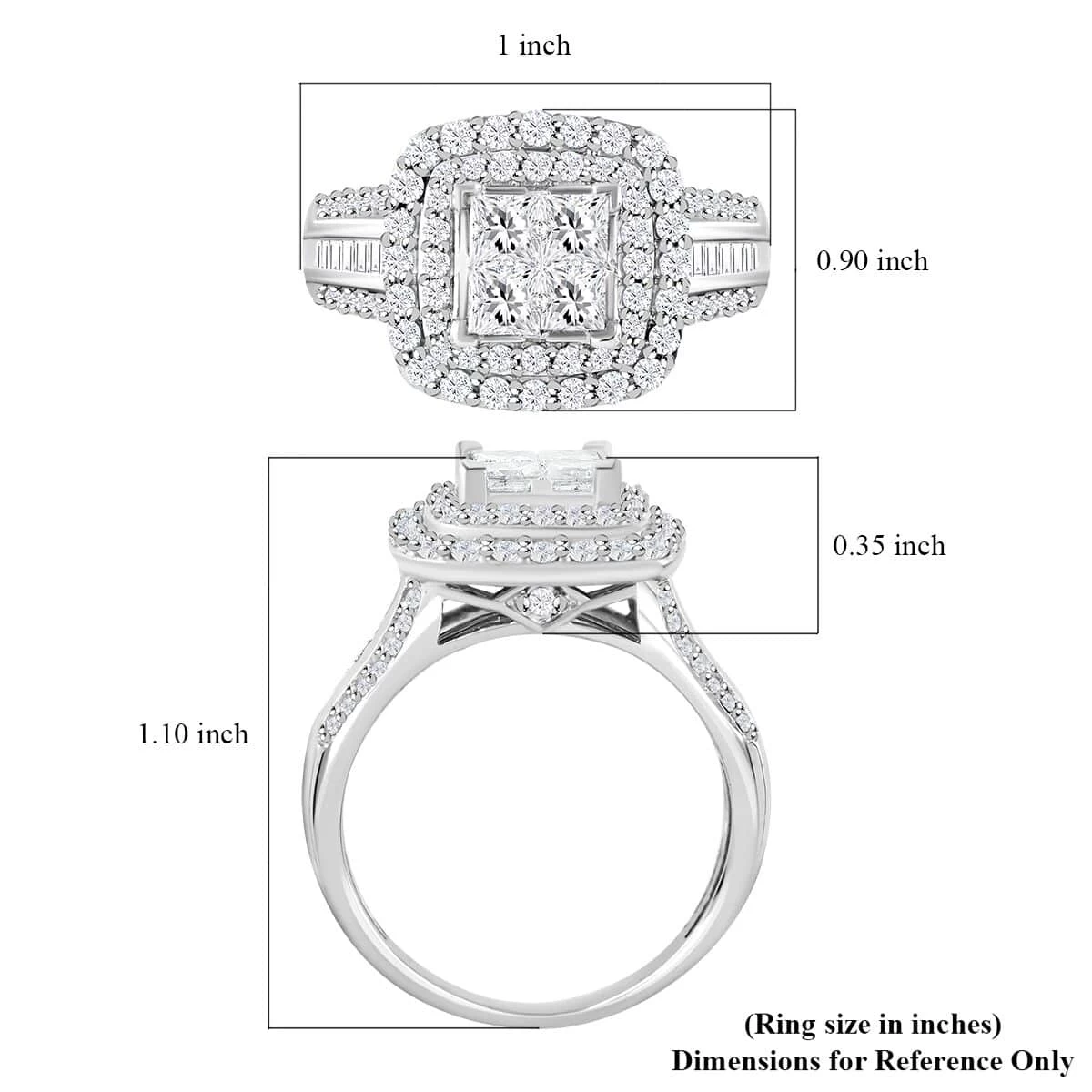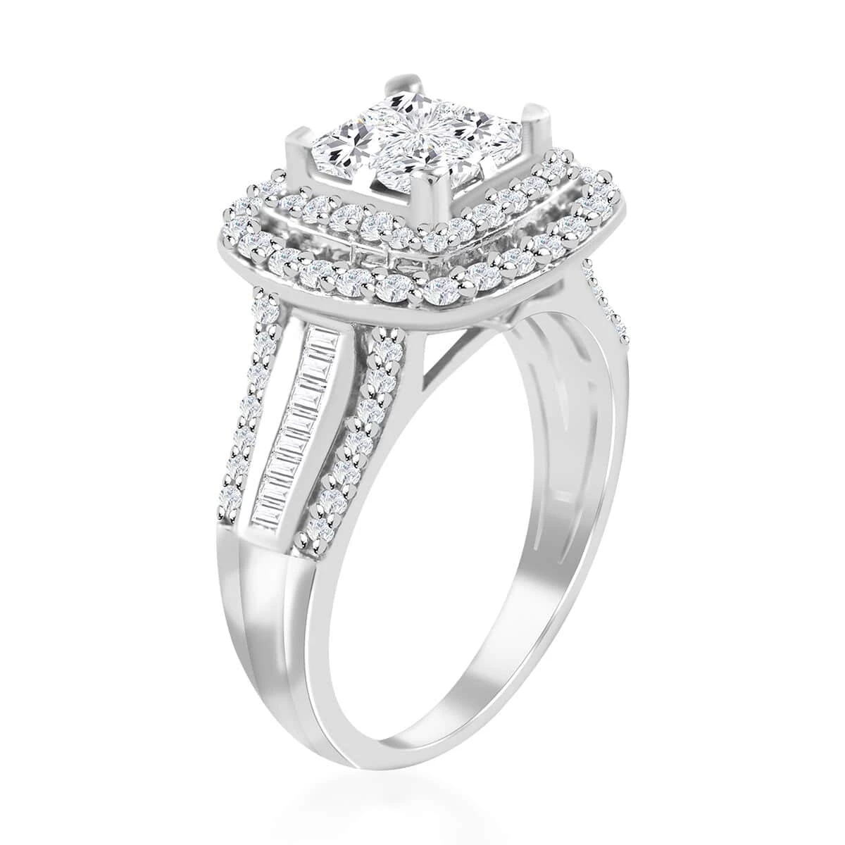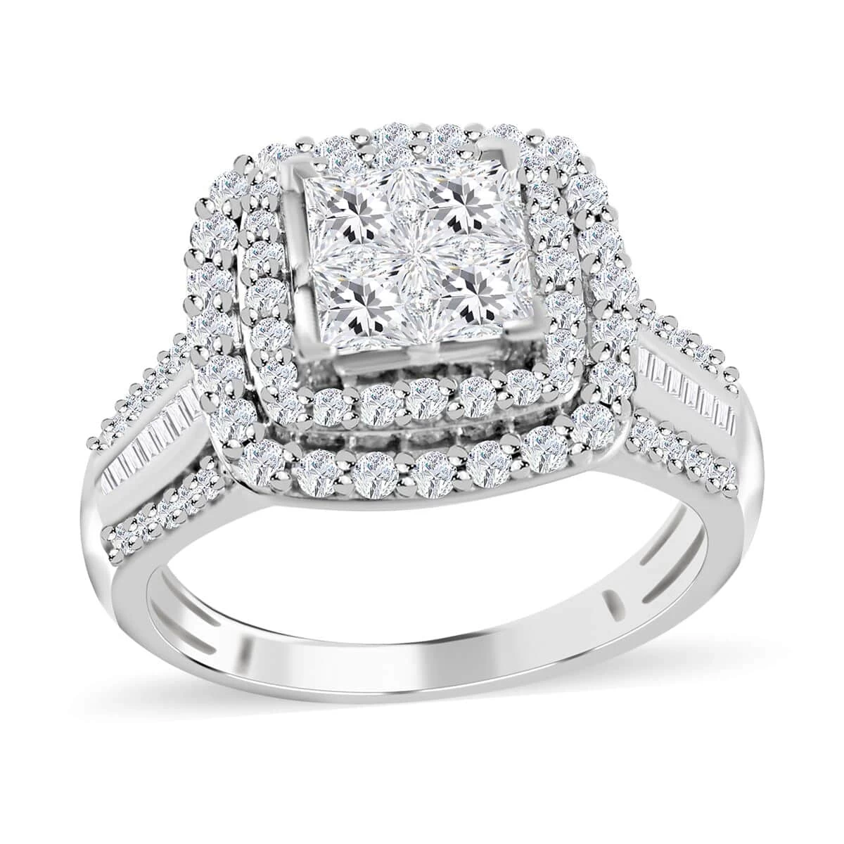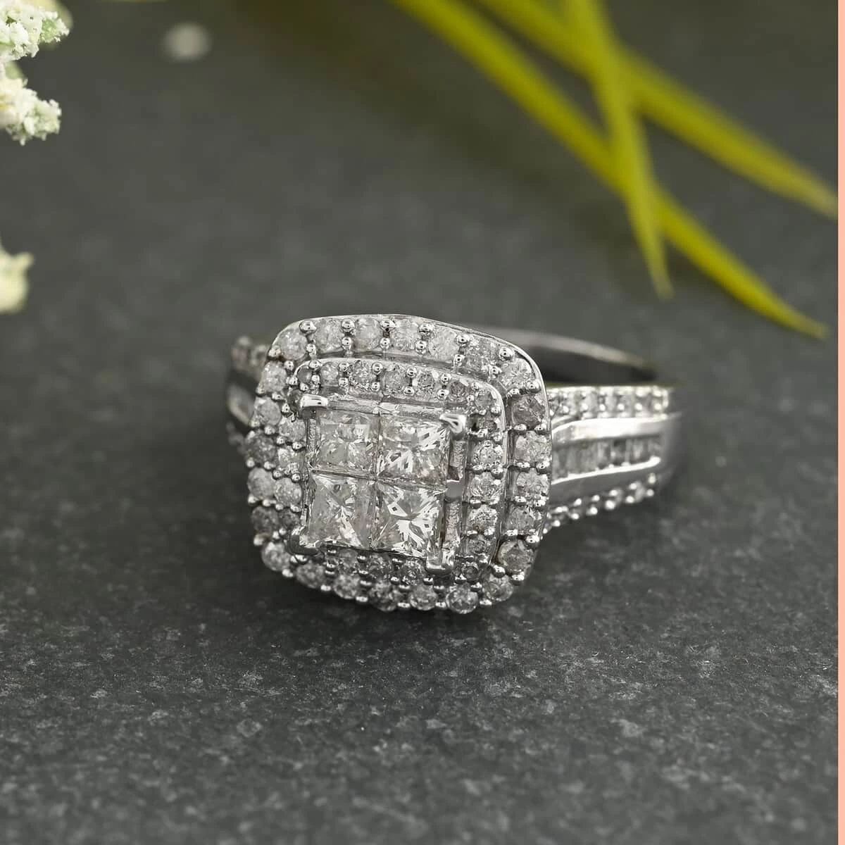 A cluster halo theme inspires this diamond ring. This 10K white gold ring features four diamonds in the center. The double halo of diamonds surrounds the center cluster. This cluster ring is made from 10K white gold, which provides a beautiful and durable setting for the diamonds.