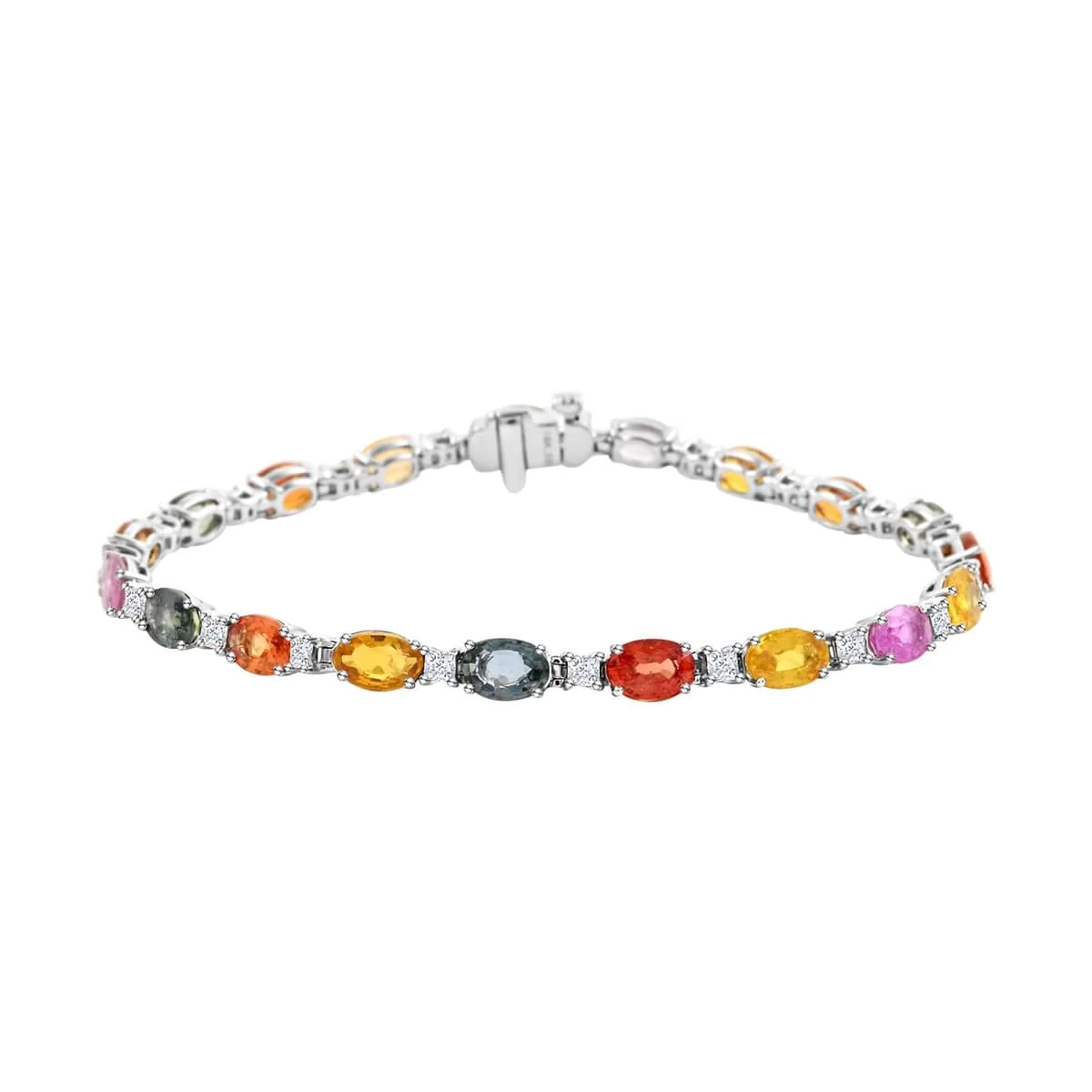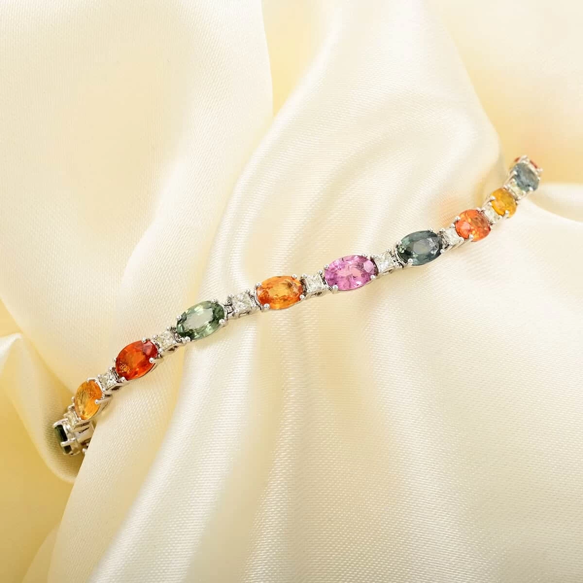 - KALEIDOSCOPE OF COLORS: The sapphires in this white gold bracelet are stories. Each gem, distinct in its shade, narrates tales of Earth’s deep secrets and cosmic wonders. From the rich depths of royal blues to the radiant brilliance of sunlit yellows, these sapphires collectively create a vibrant tapestry