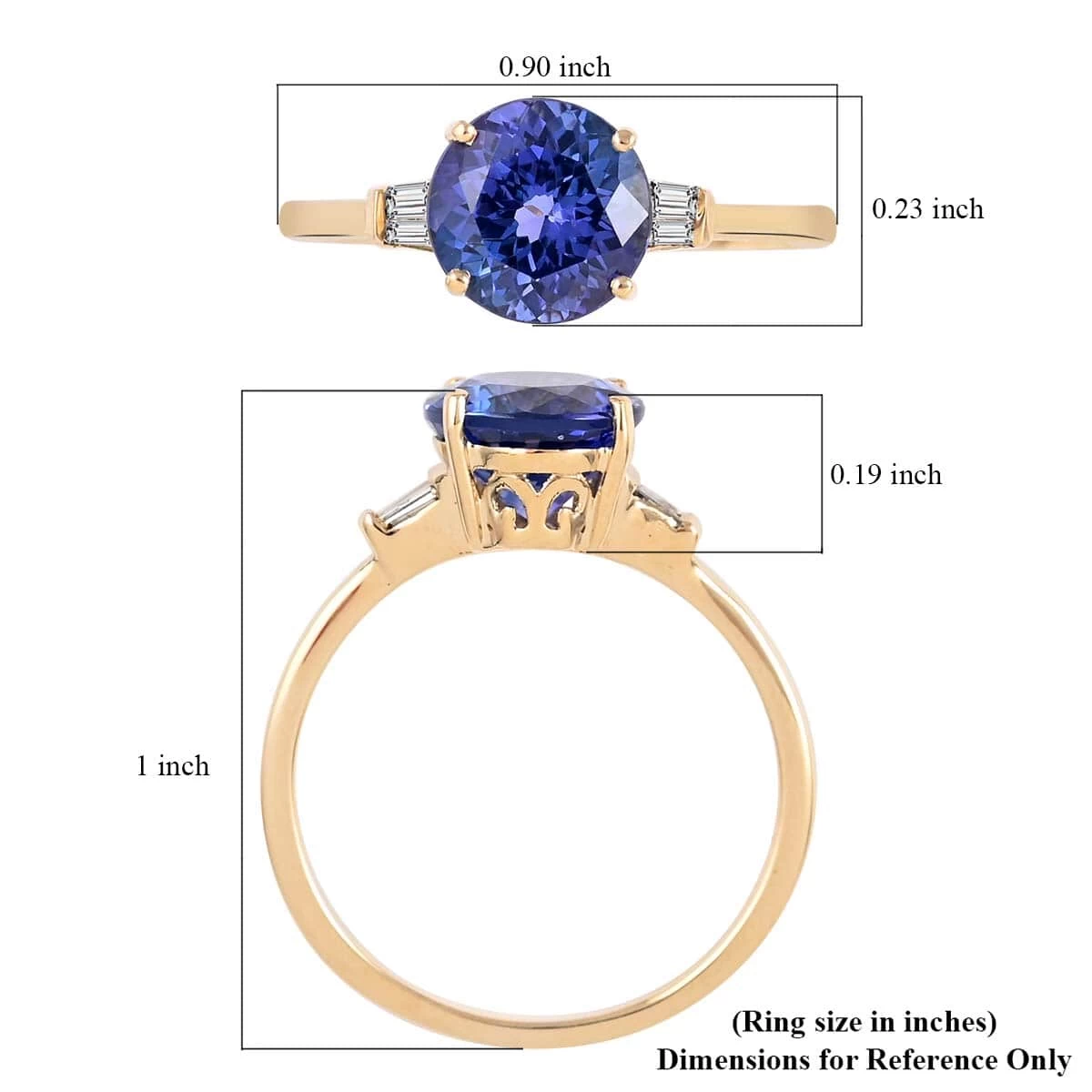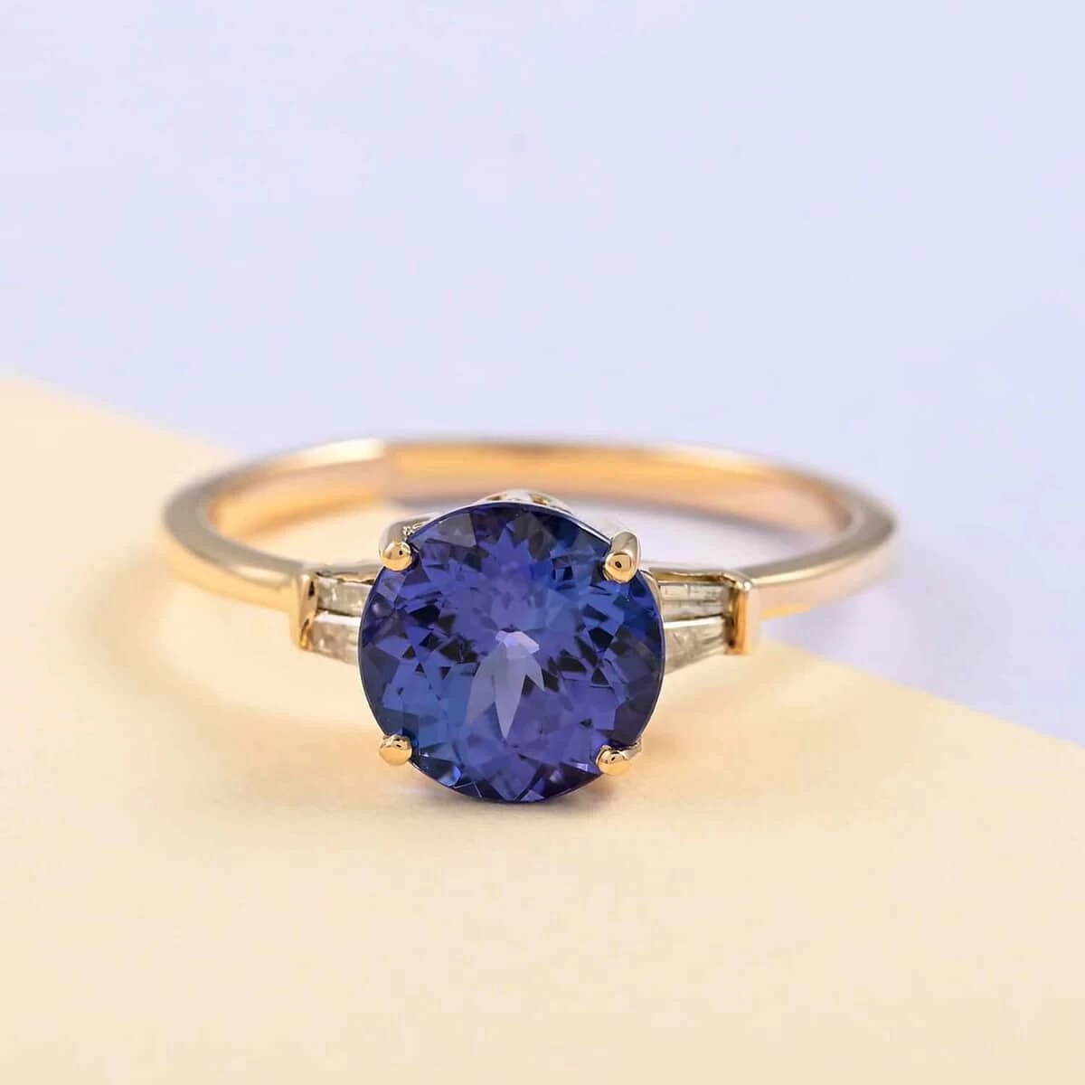 Elevate your elegance with a masterful creation – our tanzanite ring in lustrous 14K yellow gold. Centered by a spellbinding round tanzanite, flanked by shimmering diamond baguettes, it’s a symbol of timeless luxury. The seamless blend of precious gems, set against the warmth of gold, promises more than just beauty; it pledges rarity.
