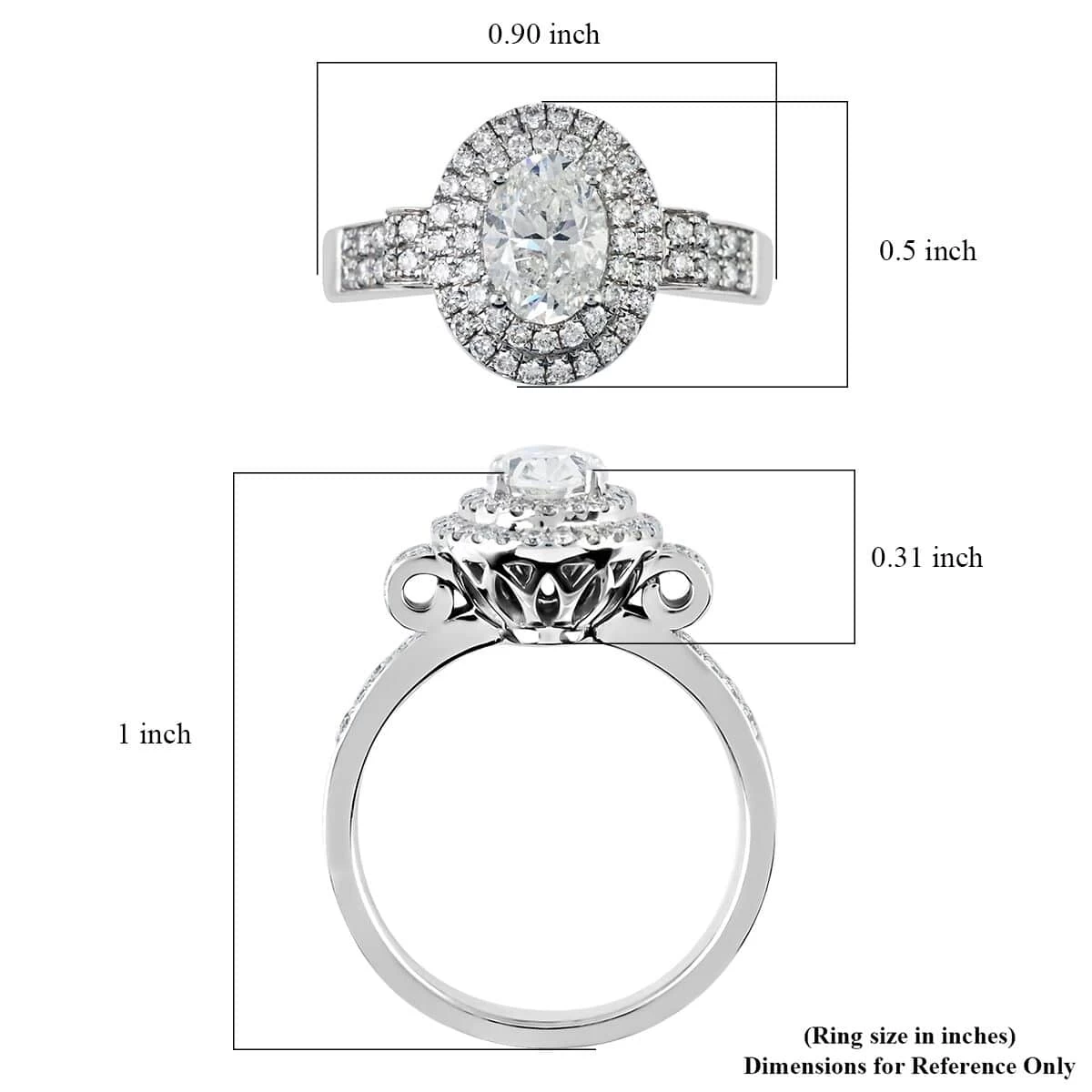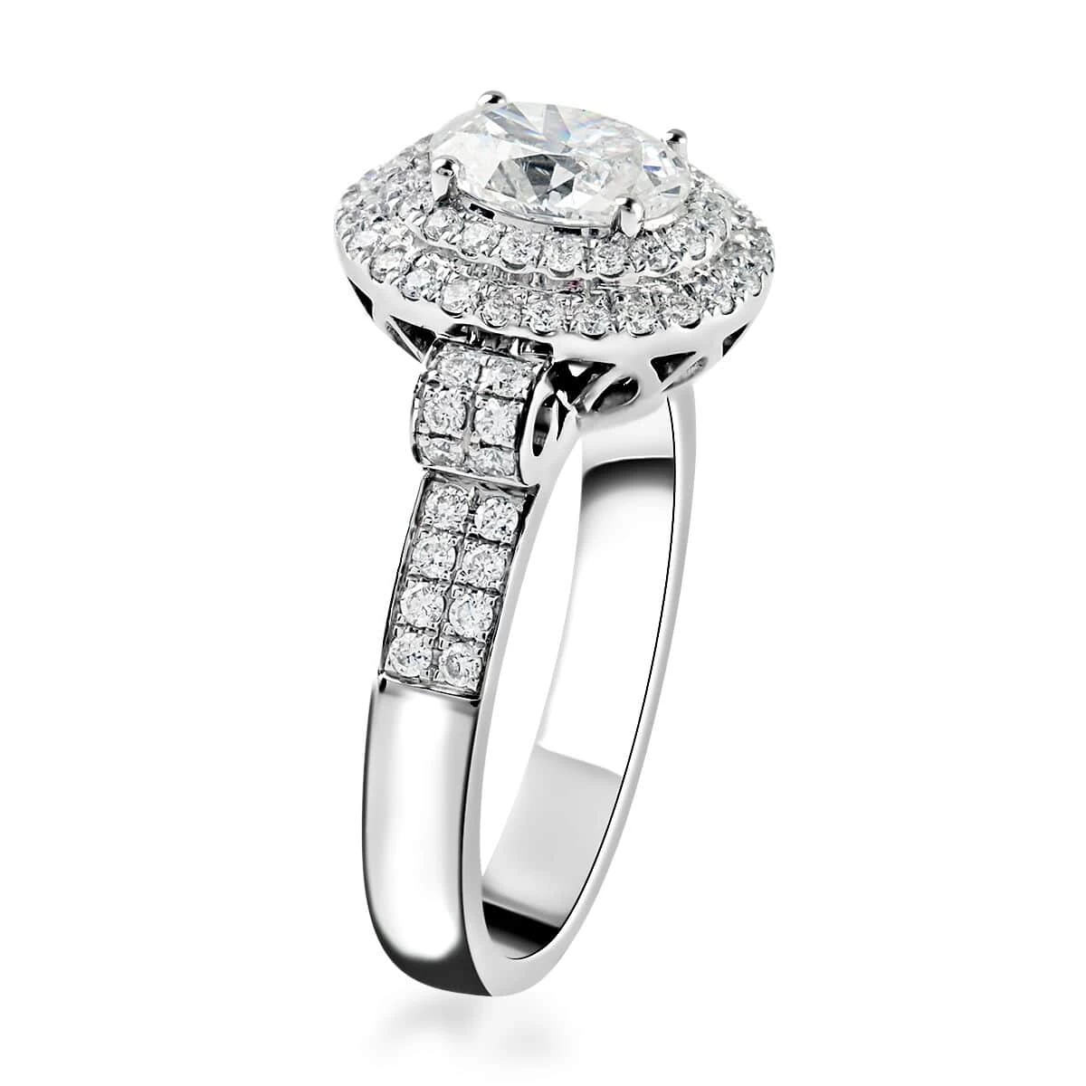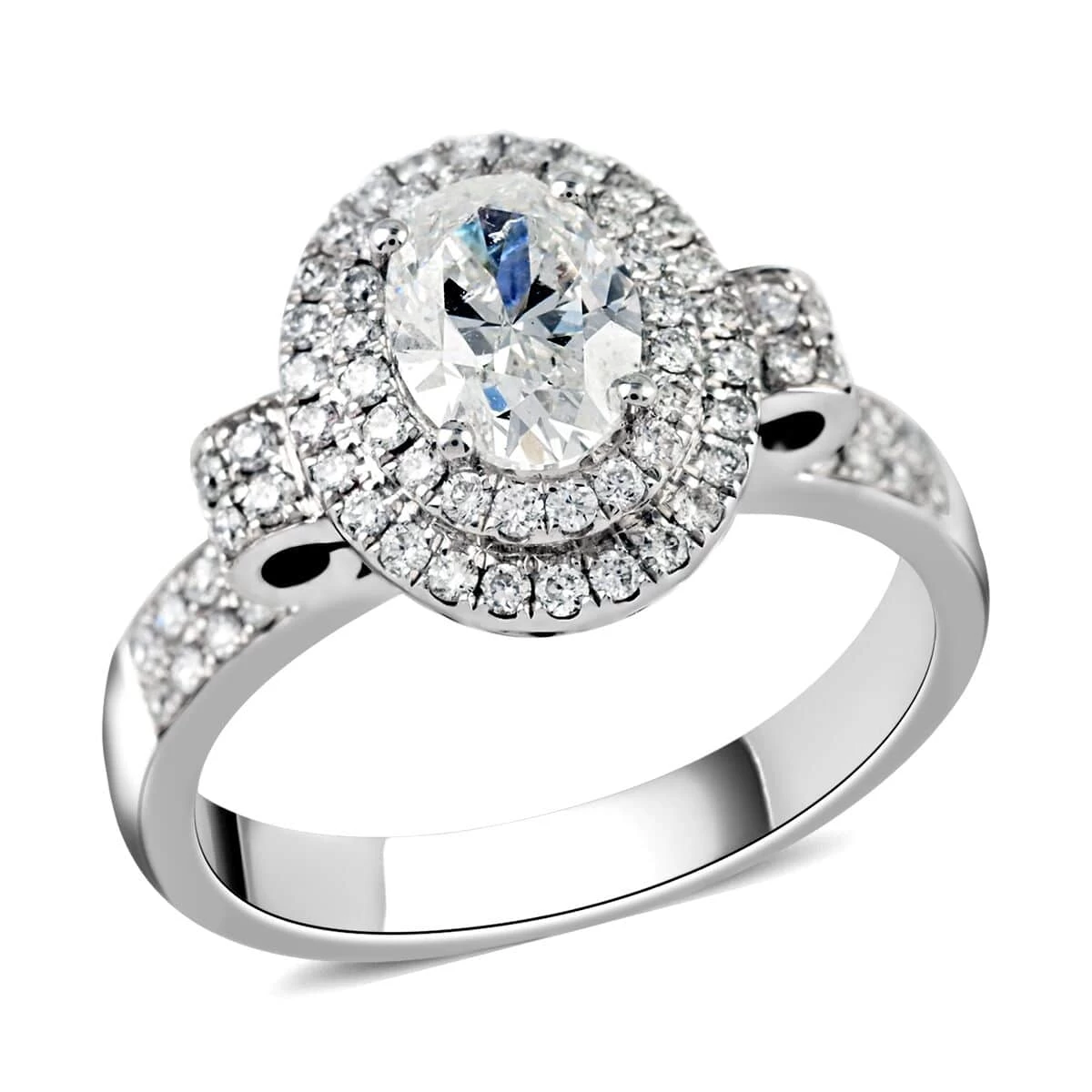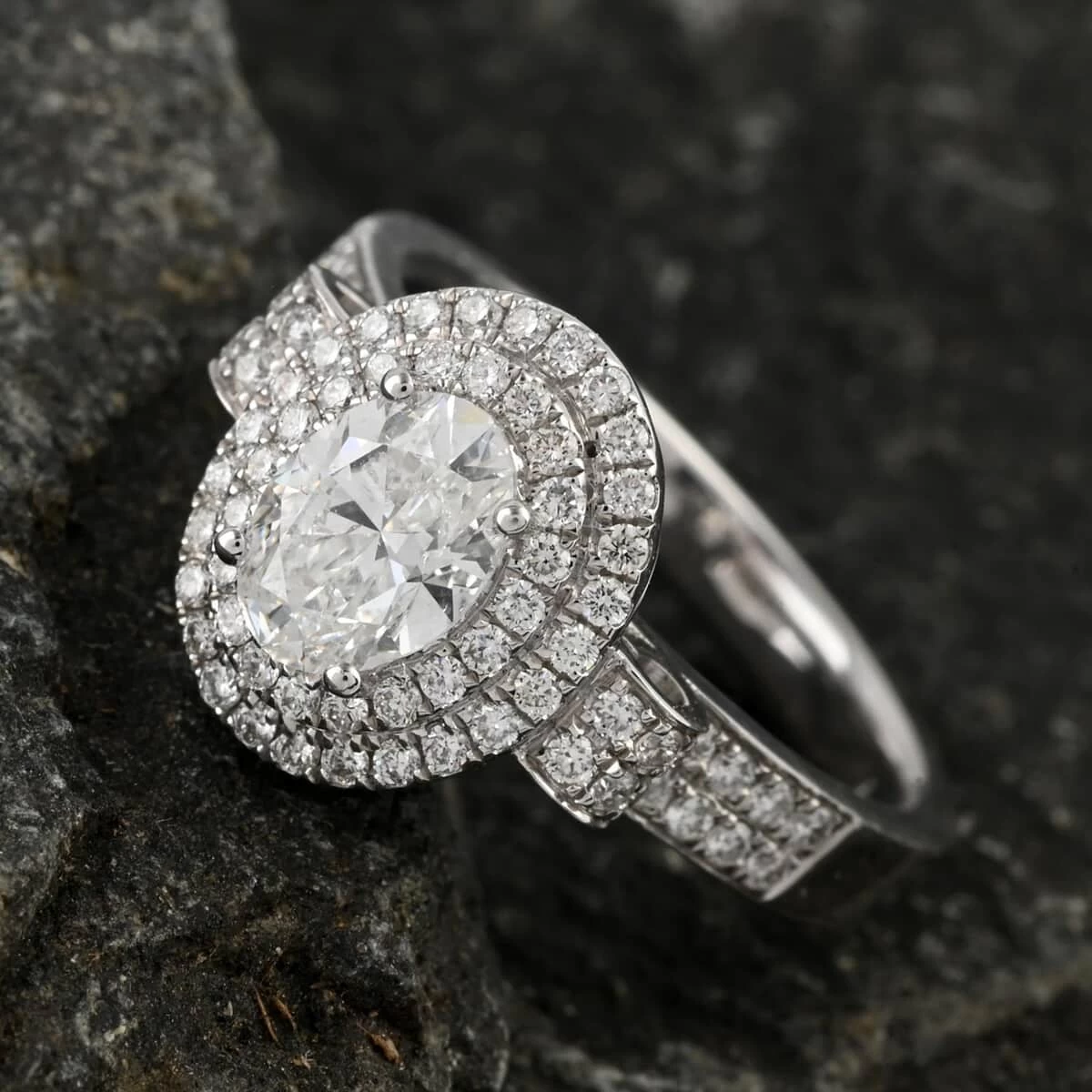 This diamond ring is breathtaking. This ring is an exquisite piece of jewelry featuring an oval-shaped diamond surrounded by a double halo of diamonds and shoulders and a shank studded with diamonds. Crafted from stunning 18K white gold, this celebrity ring will last a lifetime and dazzle the wearer for many years.Â