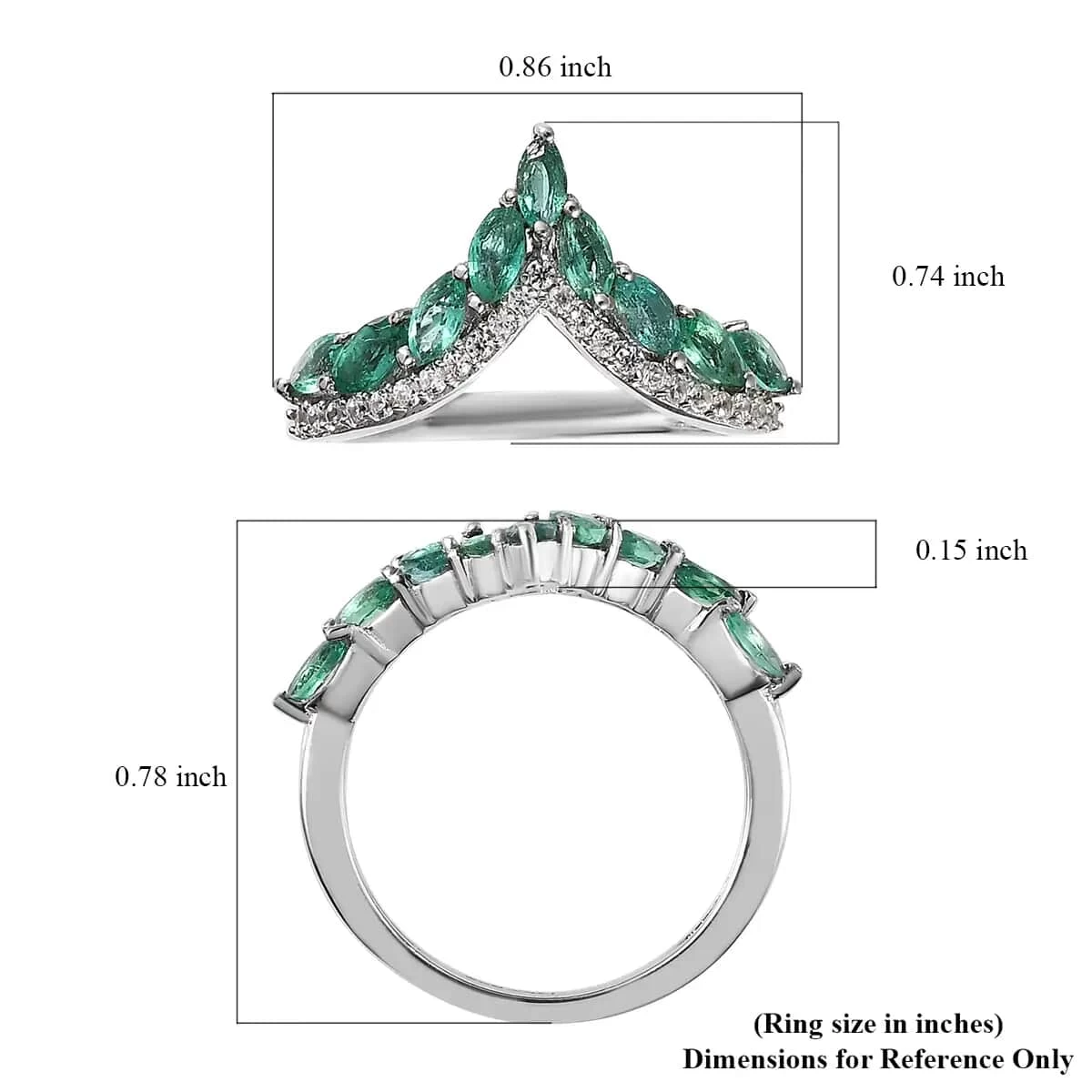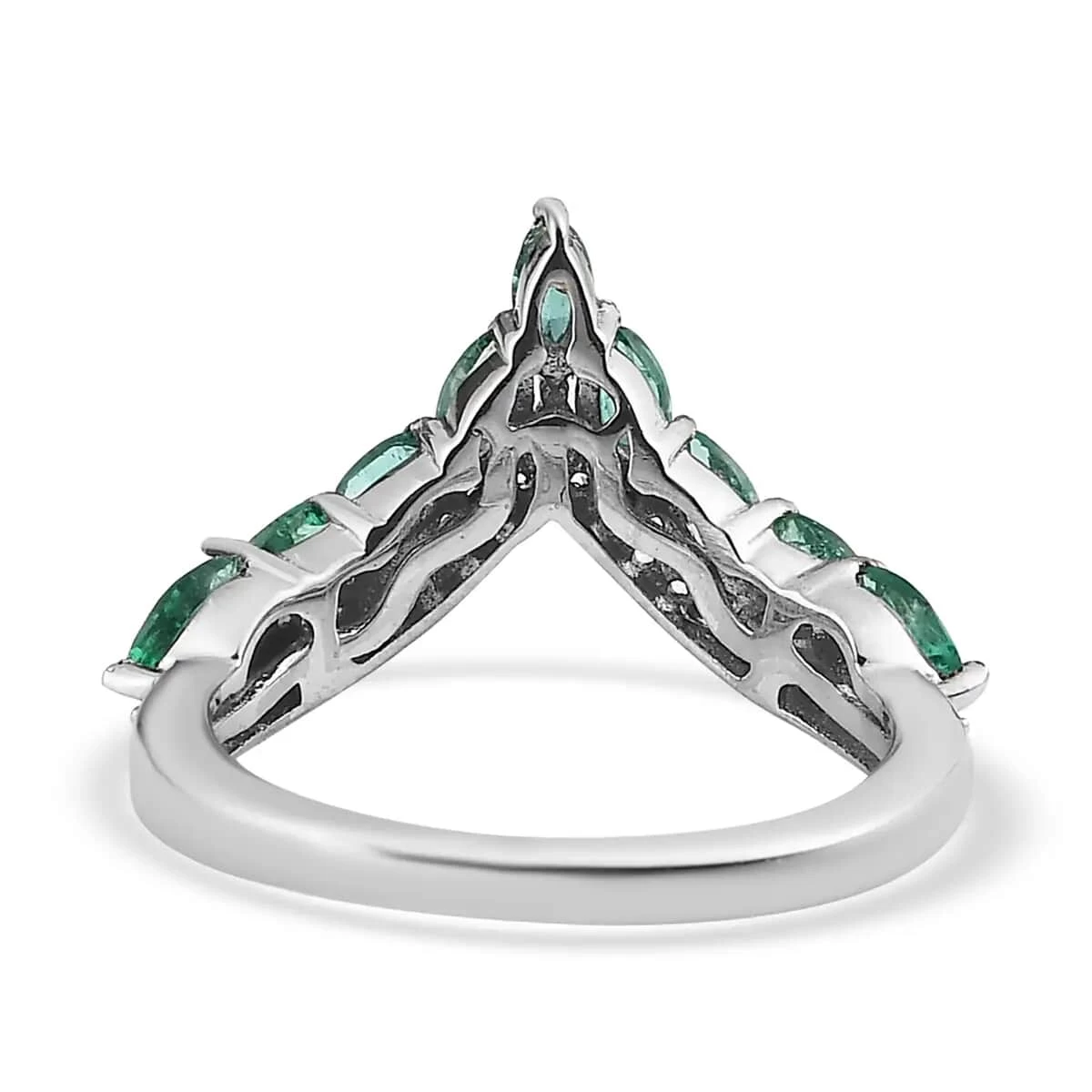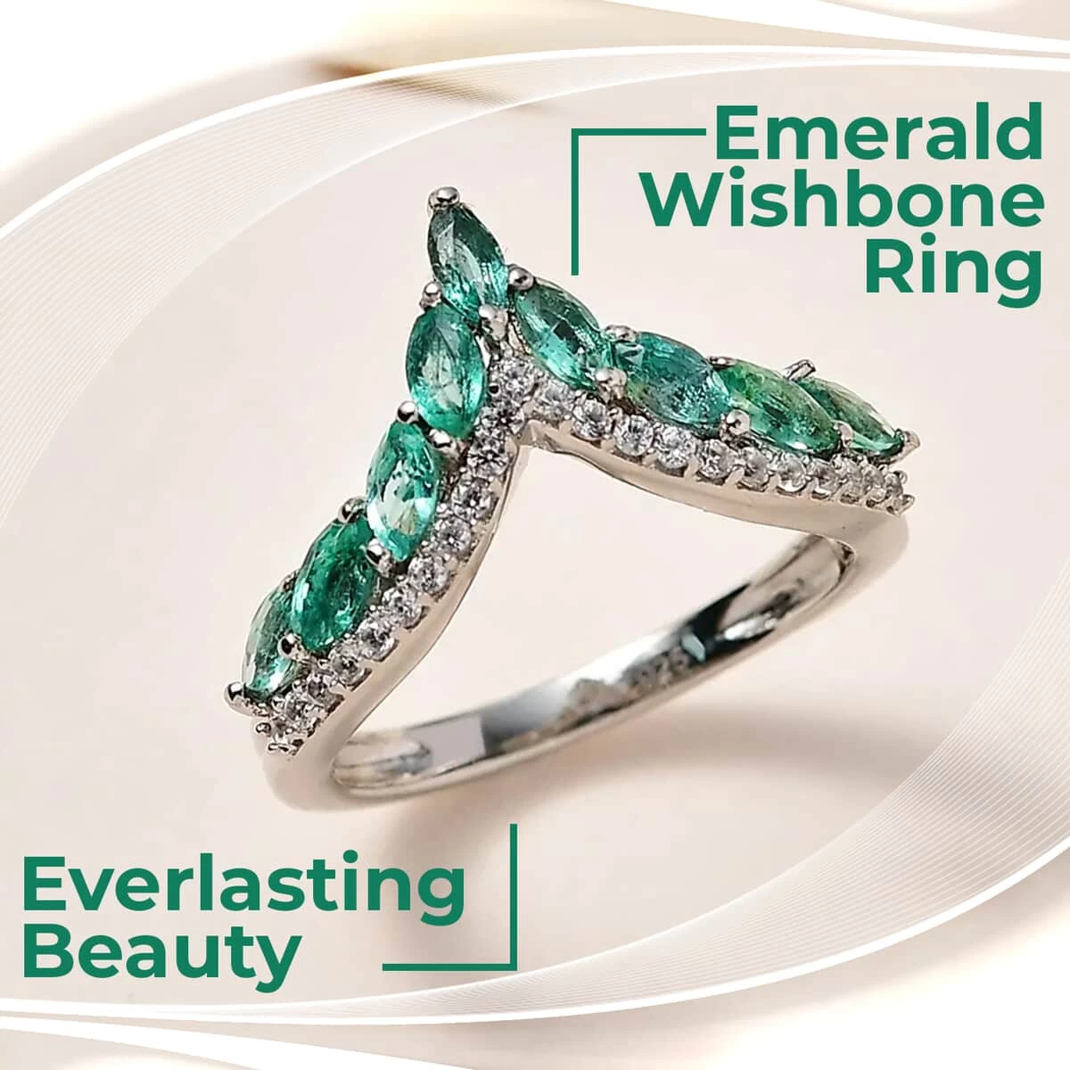 Unleash a splash of luxury with our AAA Kagem Zambian emerald ring, designed in an elegant wishbone and chevron pattern. This v-shaped ring set in platinum over sterling silver, adorned with marquise emerald and white zircons, is a jewel beyond compare. Make a wish, and may it lead you to this timeless treasure.