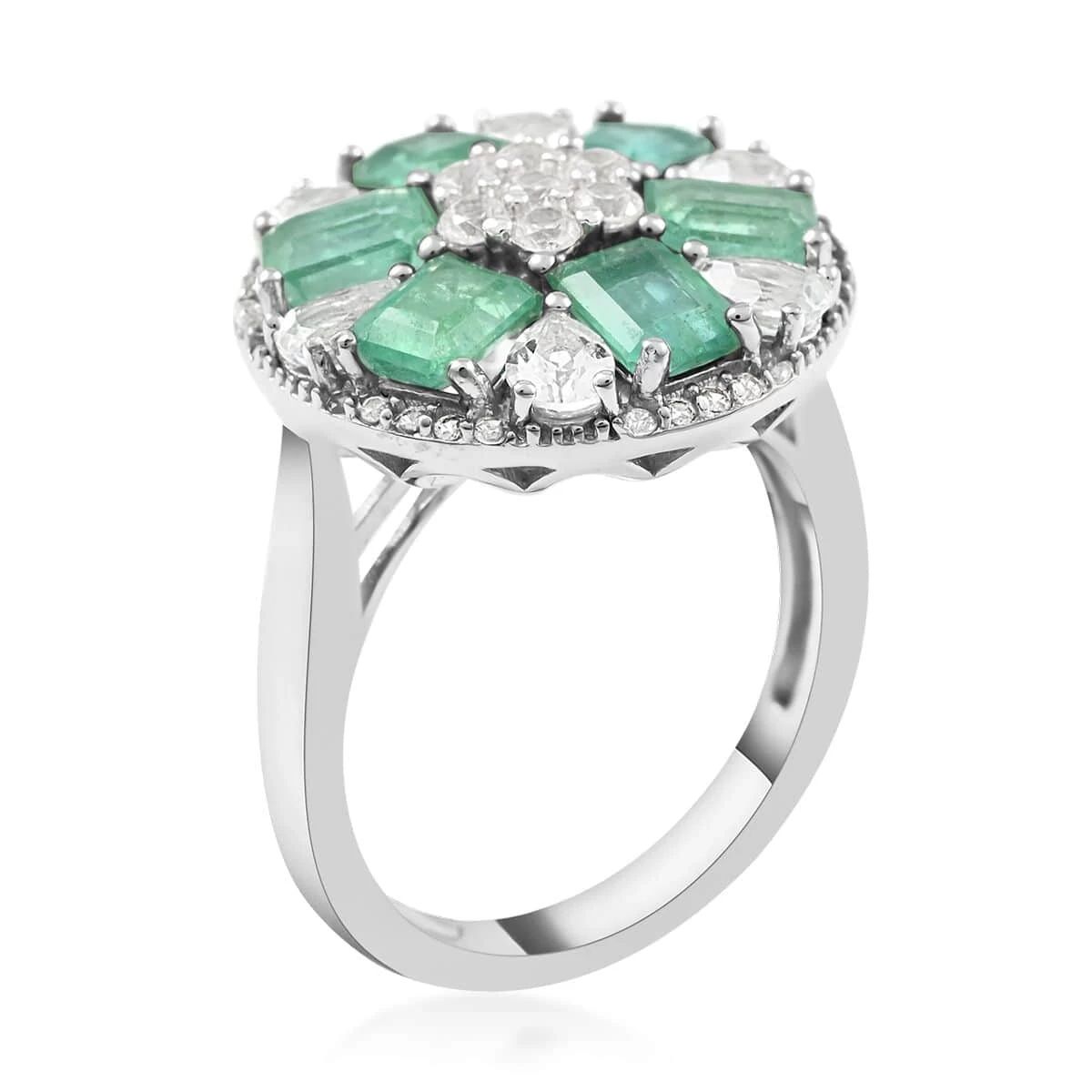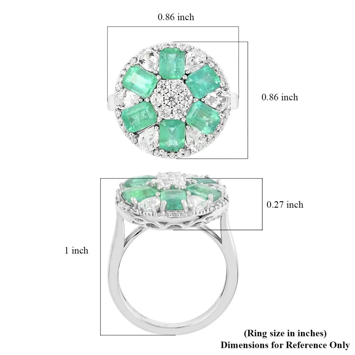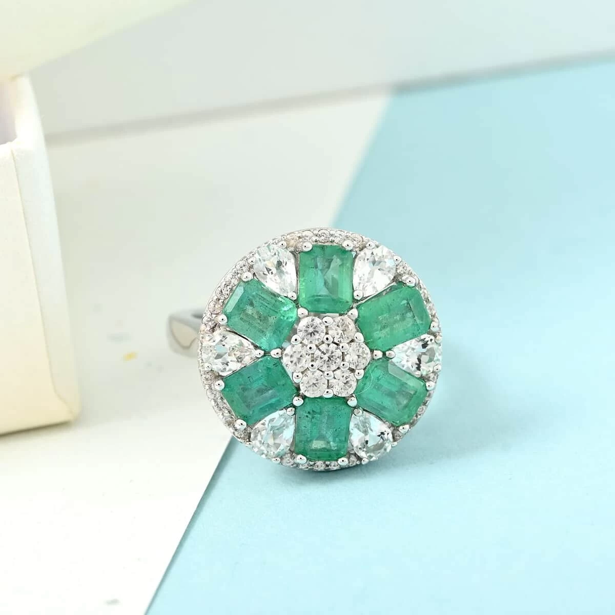 Inspired by the green Zinnia flower, this AAA Kagem Zambian Intense Green Emerald ring signifies friendship, endurance, and goodness. Floral rings are in trend for their elegance and this elongated ring represents the same. This ring features a cluster of multi-gemstones in the center highlighted by green-hued octagon-shaped gems giving an exotic look. The pear-shaped multi-gemstones embrace the groove between the arrangement of emeralds. The natural white zircons outline the entire floral design completing the look. A beautiful combination of different hued gems makes this ring one of its own kind. The hardness of emerald is eight on Moh’s scale, making it perfect for daily wear. The Birthstone of May born, this gem has an attractive color reflecting the spring arrival. This sterling silver crafted ring suits every outfit.