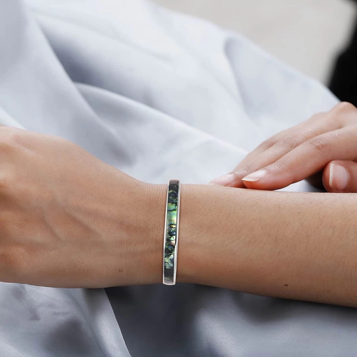 This Abalone shell bangle bracelet is inspired by a minimalistic jewelry design. This stainless steel bangle bracelet features a simplistic design showcasing the abalone shell’s iridescent colors and patterns. This bangle bracelet for women showcases a minimalistic yet modern and sleek look that allows it to be paired with any outfit.