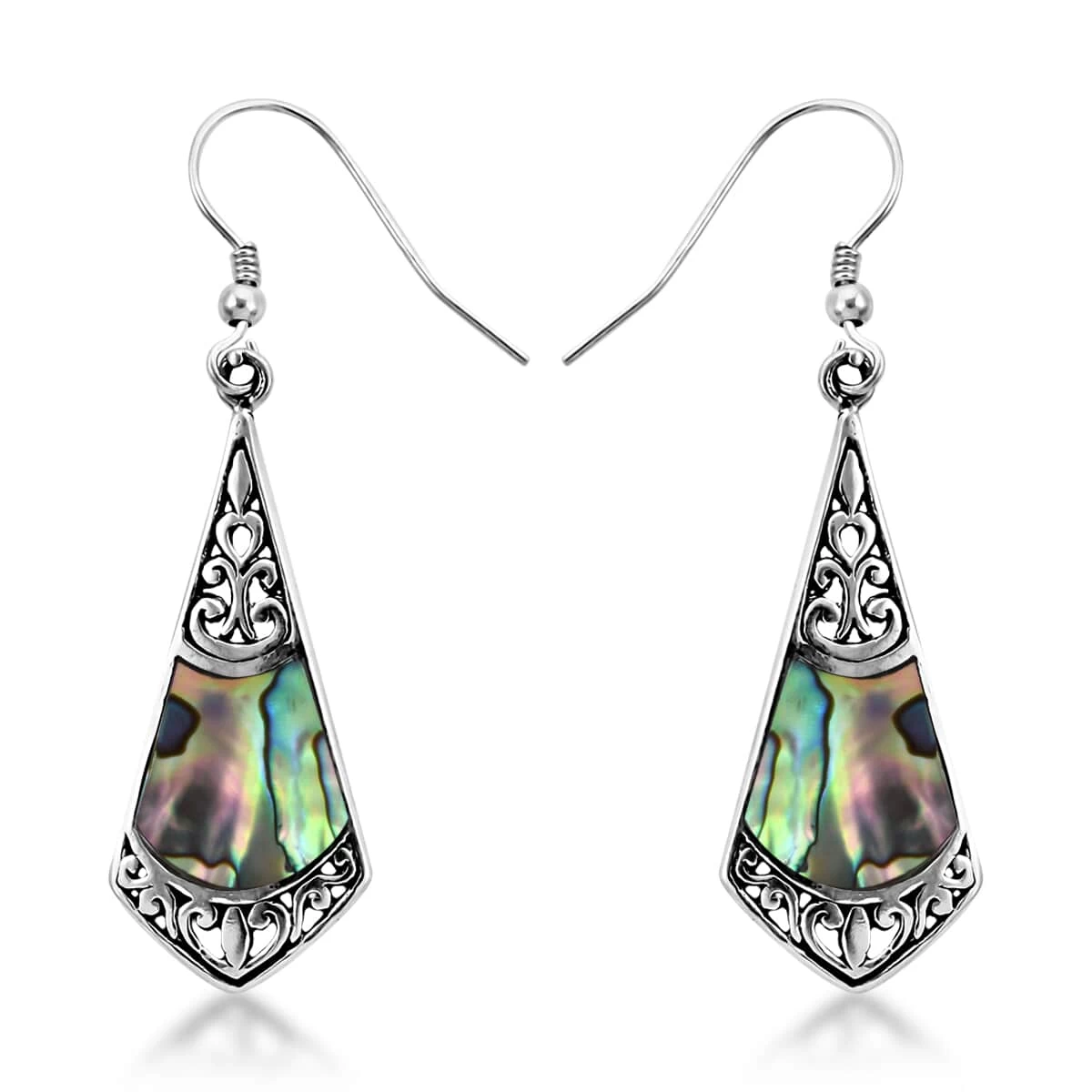 Introducing a stunning and elegant pair of jewelry, featuring lustrous abalone shells set within intricately detailed frames of sterling silver. These earrings showcase the mesmerizing hues of the abalone shell, ranging from iridescent blues, greens, and purples, creating a captivating display of color and shine that is sure to catch anyone’s eye.