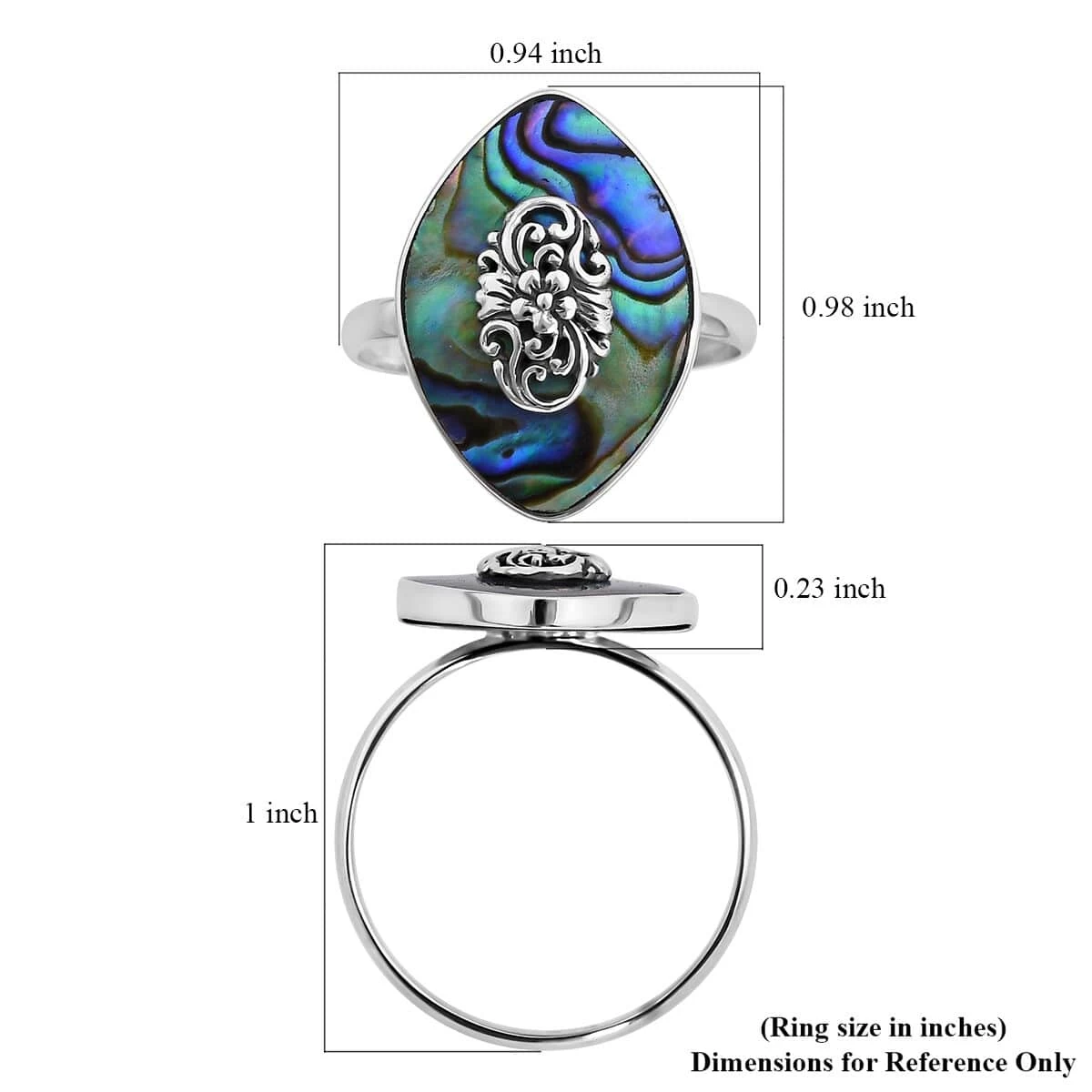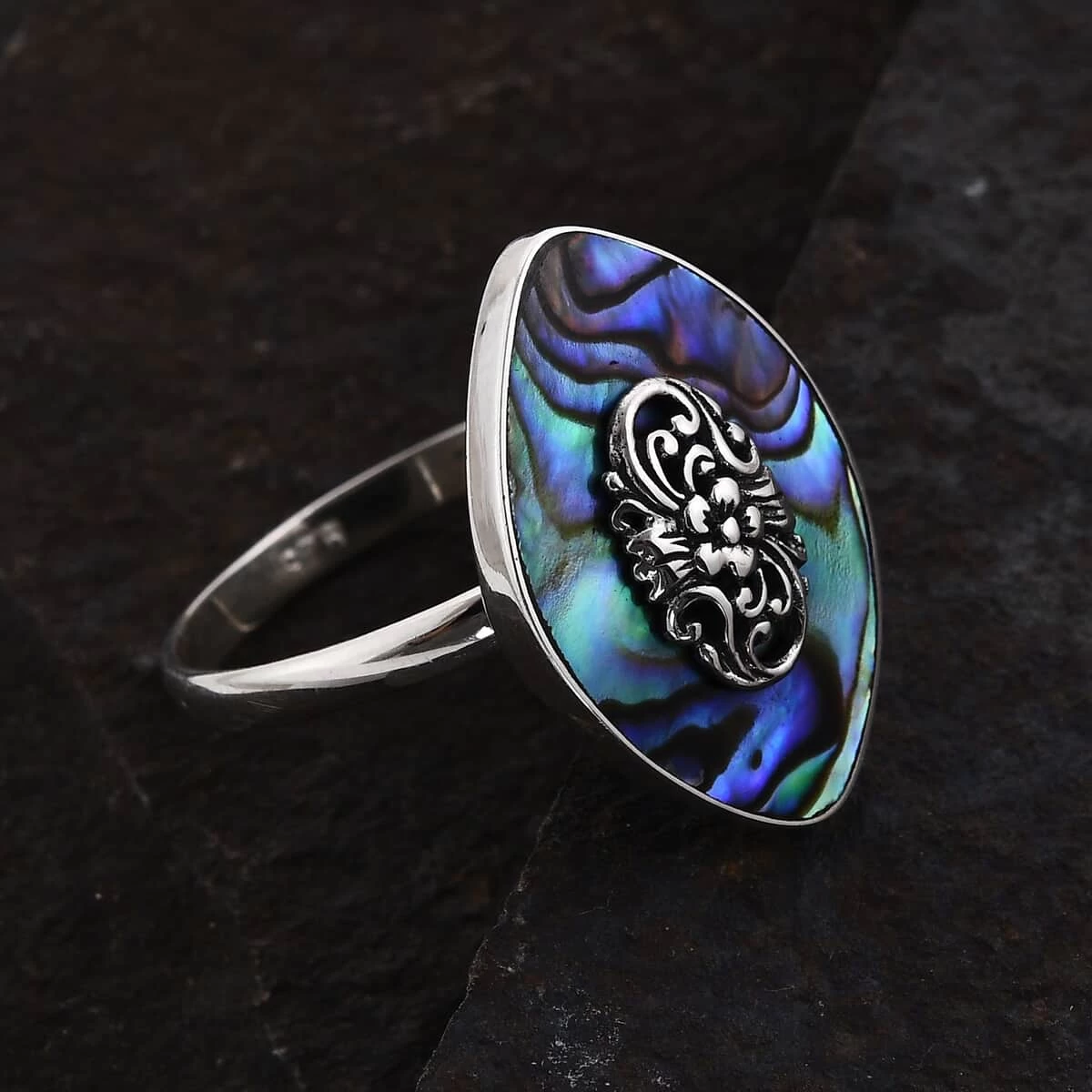 - CAPTIVATING ABALONE SHELL: The abalone shell women’s ring showcases a fancy-shaped abalone shell, known for its iridescent beauty and unique patterns