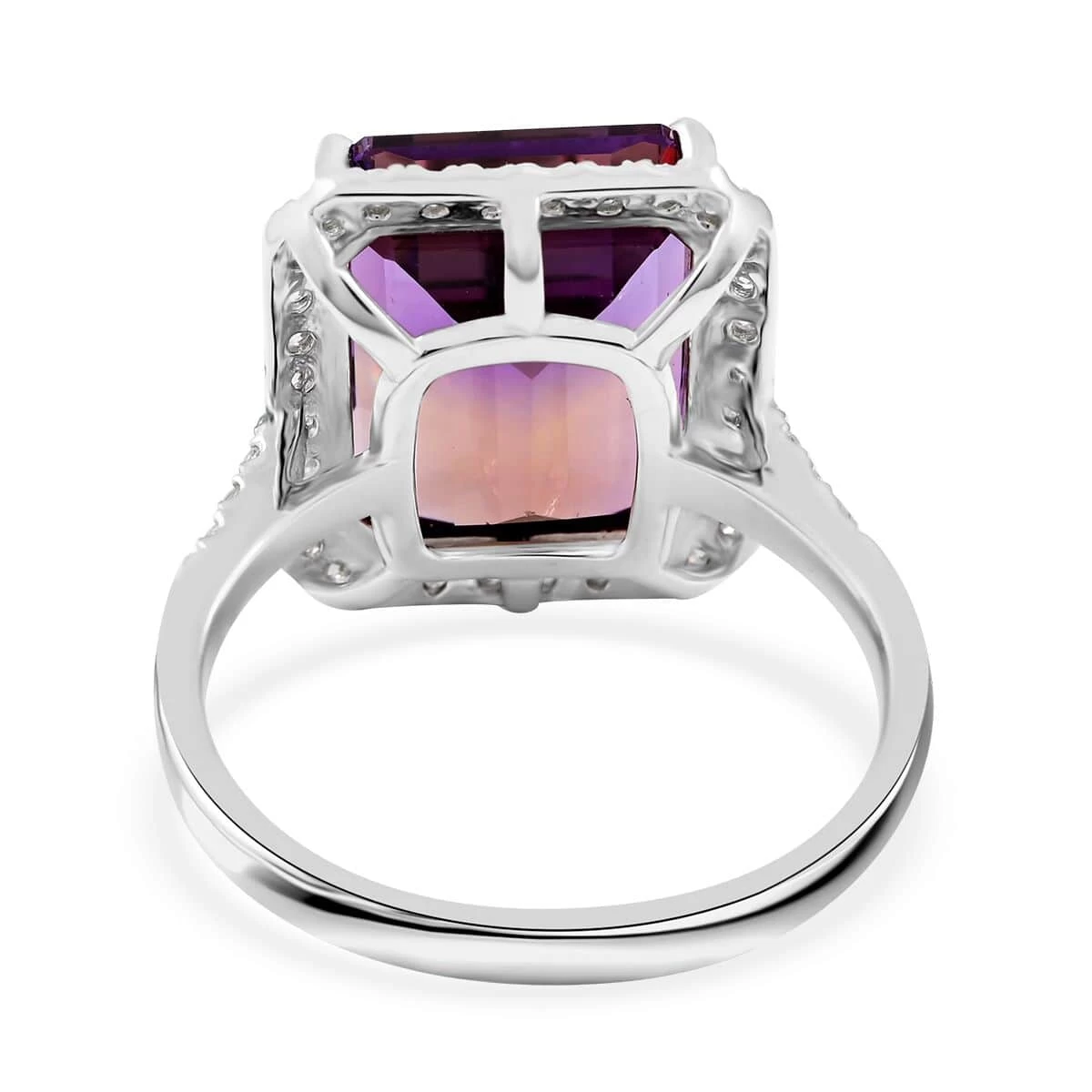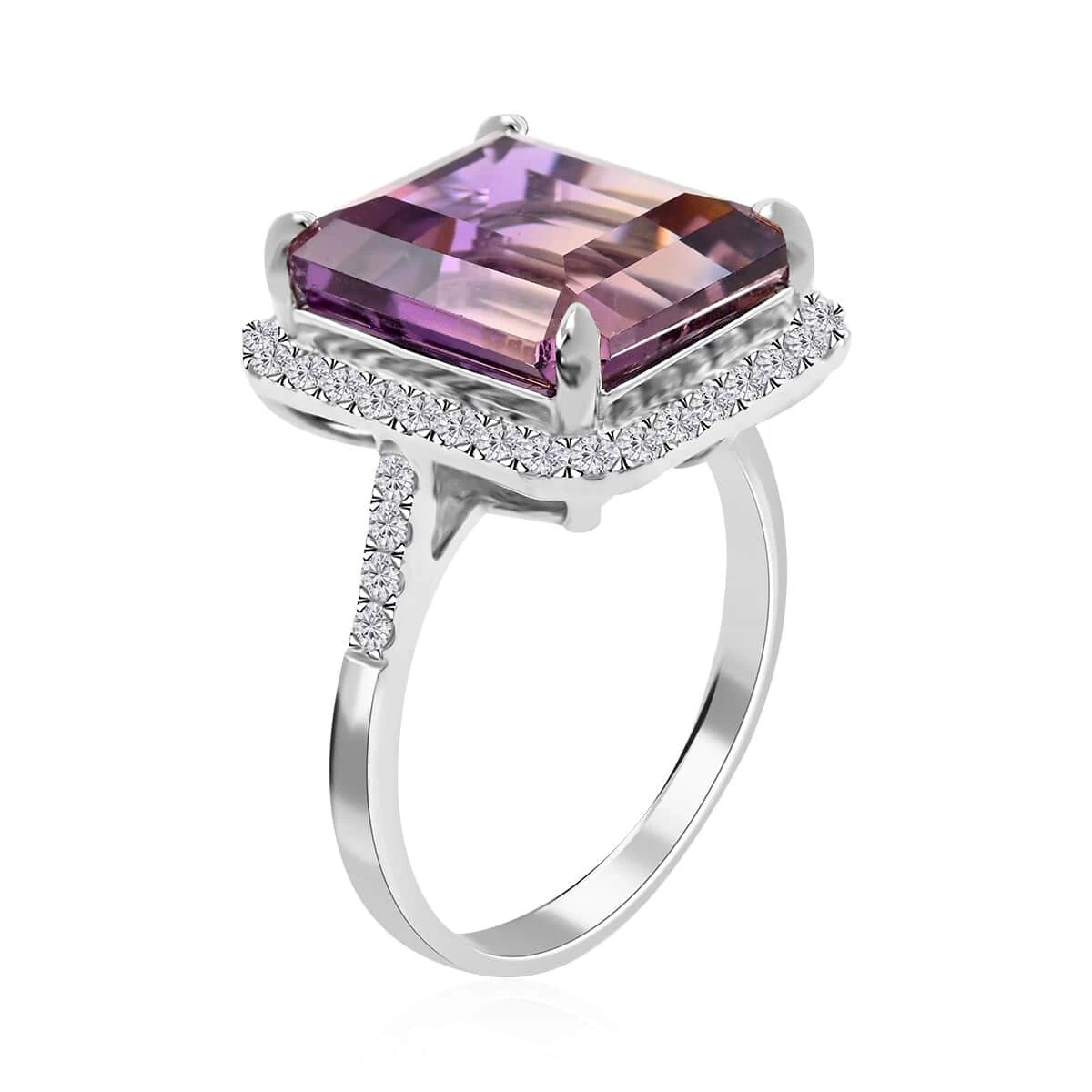 Delve into the captivating allure of our Anahi ametrine ring. Showcasing an octagon-shaped ametrine held by four prongs and enveloped in a halo of moissanite rounds, all set in rhodium over sterling silver, this women’s ring is more than jewelry – it’s a celebration of nature’s unique treasures and your radiant elegance.