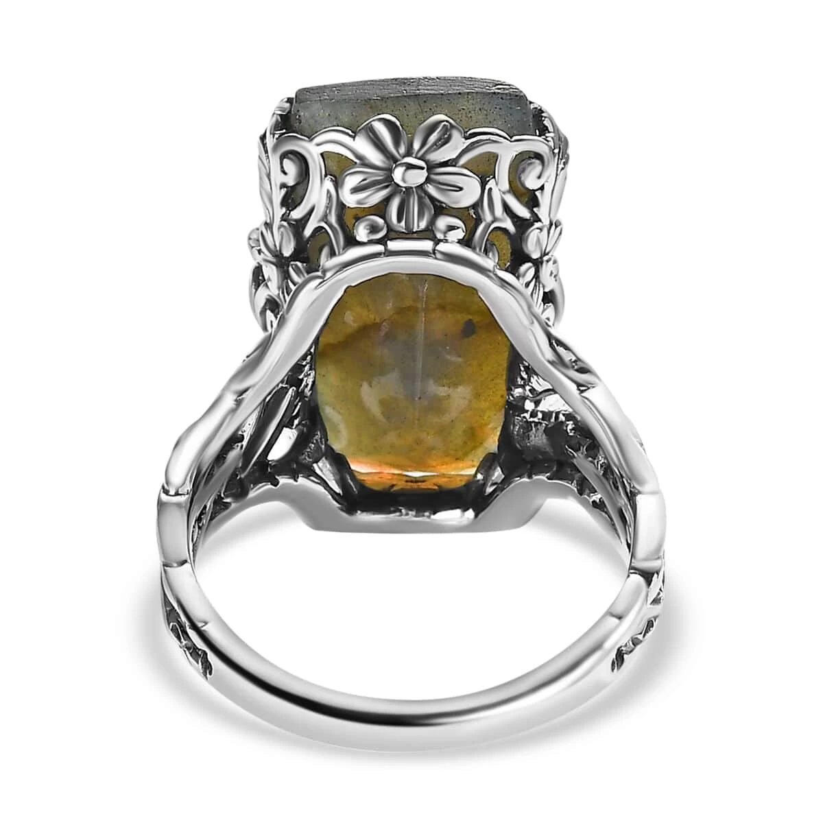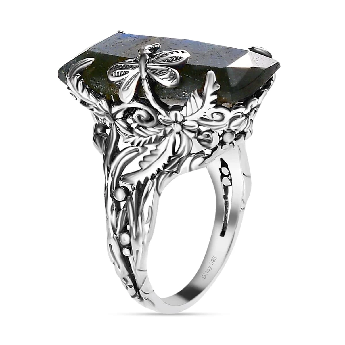 Unveil the epitome of innovative wearable art with our artisan crafted ring in sterling silver. This exquisite piece merges fine craftsmanship with timeless beauty, boasting a cushion-shaped gemstone, crowned by an intricately carved dragonfly. Engulfing the sides are floral and vine motifs, artistically crafted out of sterling silver, this soliatire ring bedazzle your hand with every movement.