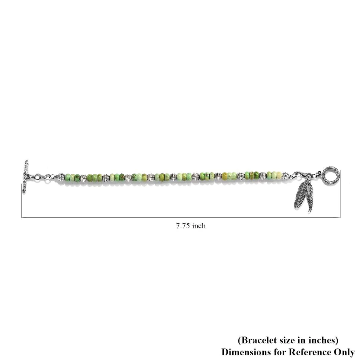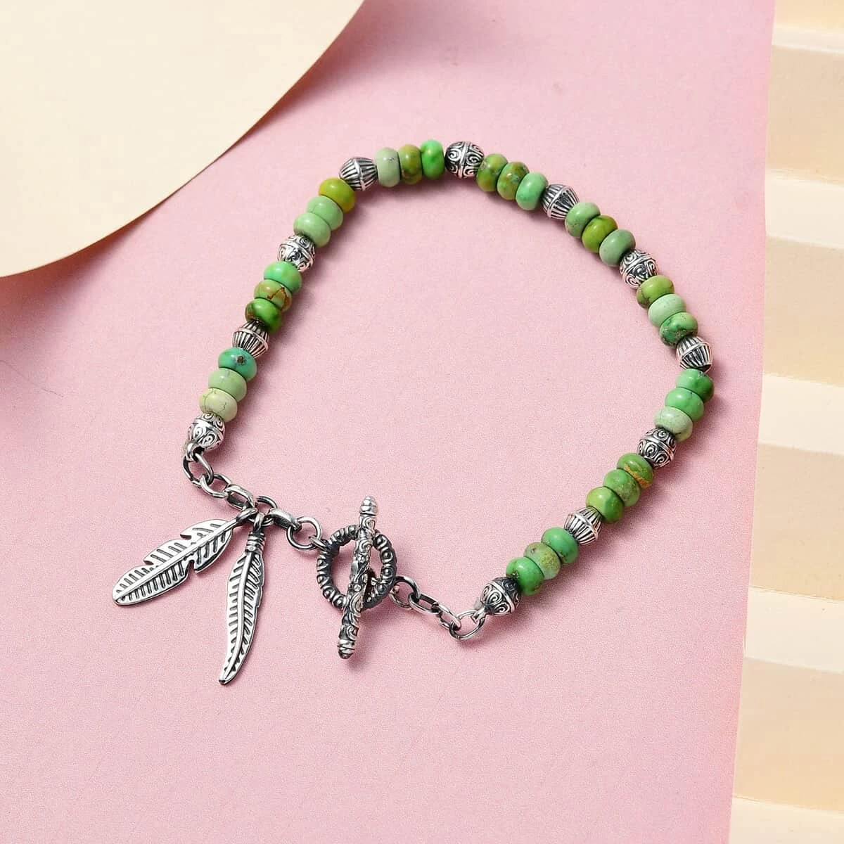 Artisan crafted natural sonoran gold turquoise bracelet resonates with the feather of birds, reflecting simplicity and exuberance of playful hues. The turquoises are finely arranged in a symmetrical row, highlighting the smooth texture of the gemstones. This turquoise bracelet is carefully crafted in sterling silver, complementing the lush of the gemstone. This artisan crafted bracelet conveniently slides on your wrist and adds to your bold appearance. It is a minimalist bracelet that would enhance your party look or accessorize your outfits in daily rotation as well. The feathers of birds signify strength and wisdom. The artisans melted, rolled, and cut the beads of silver to give a unique look to the bracelet.