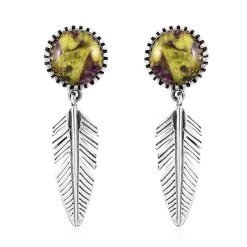 - GEMSTONE DETAILS: The feather earrings feature a round-shaped Tasmanian stichtite gemstone, which is known for its vibrant purple and green hues. The gemstone is set in a fancy setting that enhances the beauty of the stone and the overall design of the earrings