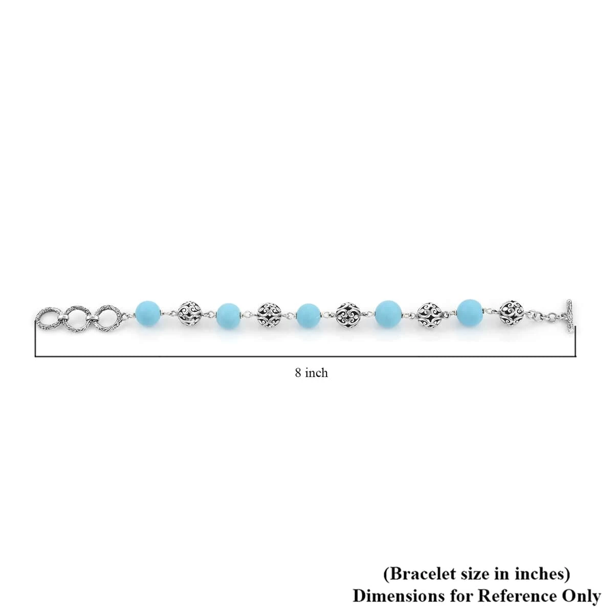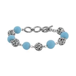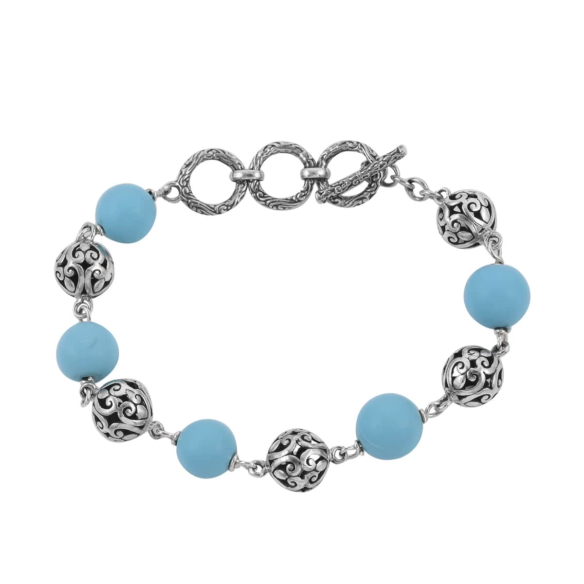 Inspired by the distinctive culture of Balinese and Javanese people, this Bali legacy American natural sleeping beauty turquoise bracelet gives an aesthetic appearance with its exceptional artistry. Contemporary artwork symbolizes culturally diverse designs. The turquoises are embellished in a symmetrical row with detailed metal designs. Sleeping beauty turquoise is the only variety that is found without veining on the surface, highlighting the smooth texture with subtle blue hues. The artisans have set all the beads reflecting the high polish and lustrous finish, giving a vintage finish to the bracelet. This Bali Legacy bracelet is crafted in sterling silver, sustaining the stylish appeal of the bracelet. The toggle clasp offers comfort fit with a firm grip. Bali Legacy collection offers designs with intricate details highlighting the exotic culture of Balinese people.