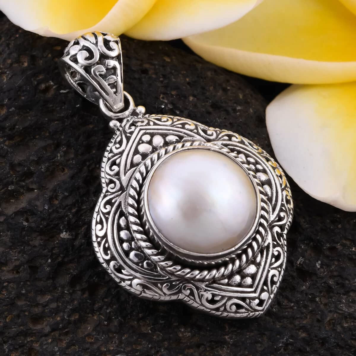 - ELEGANT ARTWORK: The round mabe pearl in the center is graciously complemented by creative metal artwork to complete this Bali Legacy pendant