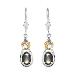 Elevate your style and captivate the room with these exquisite Bankacha natural black star sapphire dangling earrings. Indulge in the mesmerizing allure of rich vermeil yellow gold and platinum-plated sterling silver, beautifully complemented by the ethereal contrast of two-tone sterling silver craftsmanship. Designed to make you stand out, these earrings boast an oval-shaped sapphire drop that gracefully suspends from a tanzanite roundel adorned dangle frame.