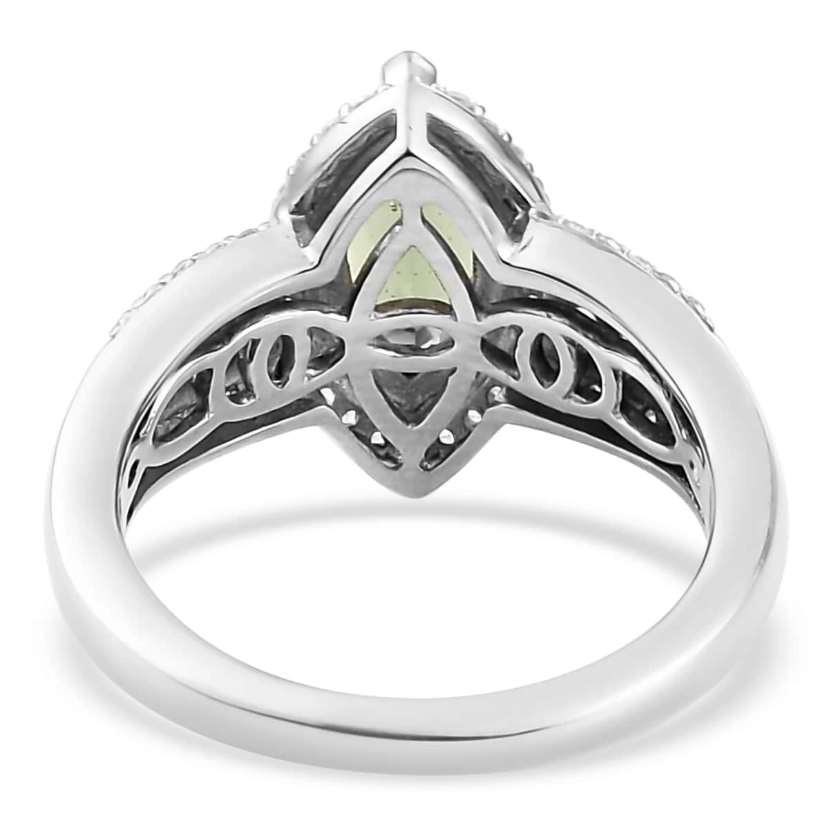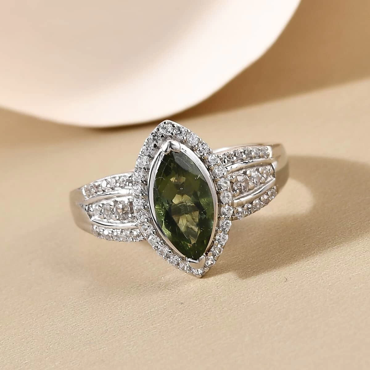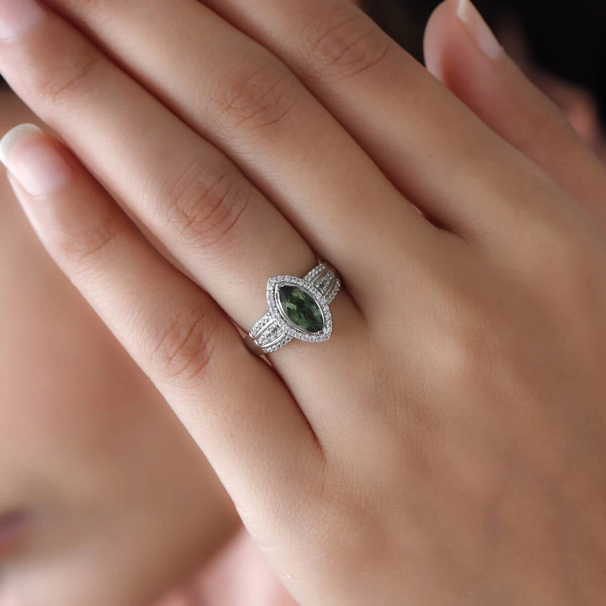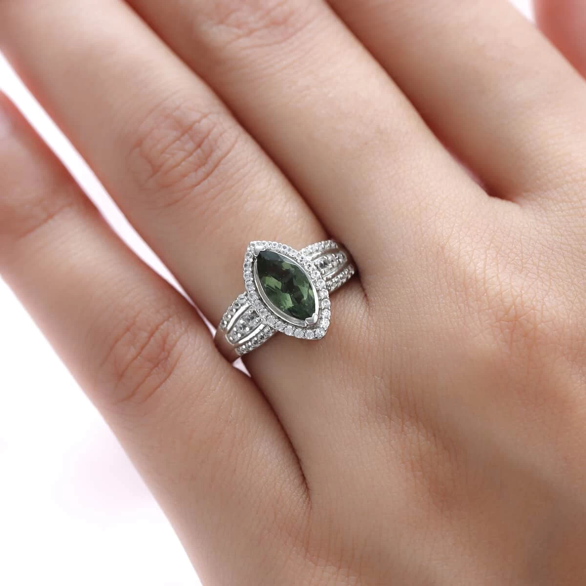 This halo-inspired ring is crowned with amazing Bohemian moldavite exuding irresistible luster. The zircon-loaded shank is creatively designed with utmost precision. The granular setting of zircons makes this ring an extravagant piece of royal jewelry. Creating a great look with any outfit you pair it with, this ring shows off your fashion skills.