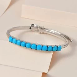 Sleeping Beauty Turquoise Bangle Bracelet In Platinum Over Sterling Silver (7.25 In) 6.50 Ctw