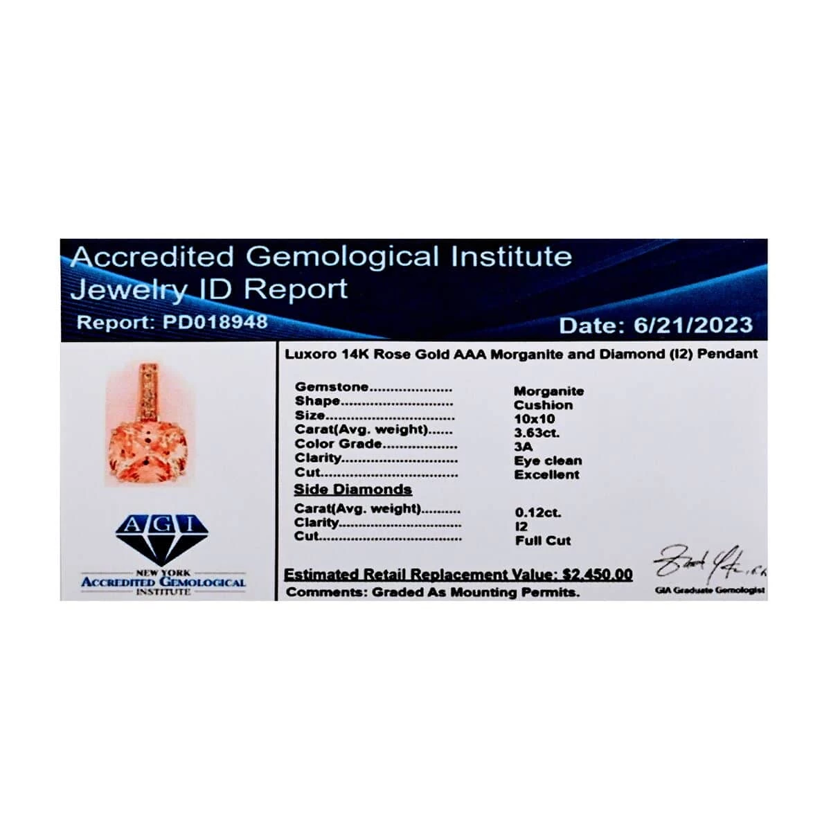 Unveil the beguiling allure of this certified and appraised Luxoro AAA Marropino morganite and diamond pendant. This masterpiece is an enchanting symphony of warm hues and luminous sparkles, with an enticing blend of authenticity and empowered elegance. Crafted with committed precision and dedication, this pendant embodies both a powerful statement and a trustworthy investment.