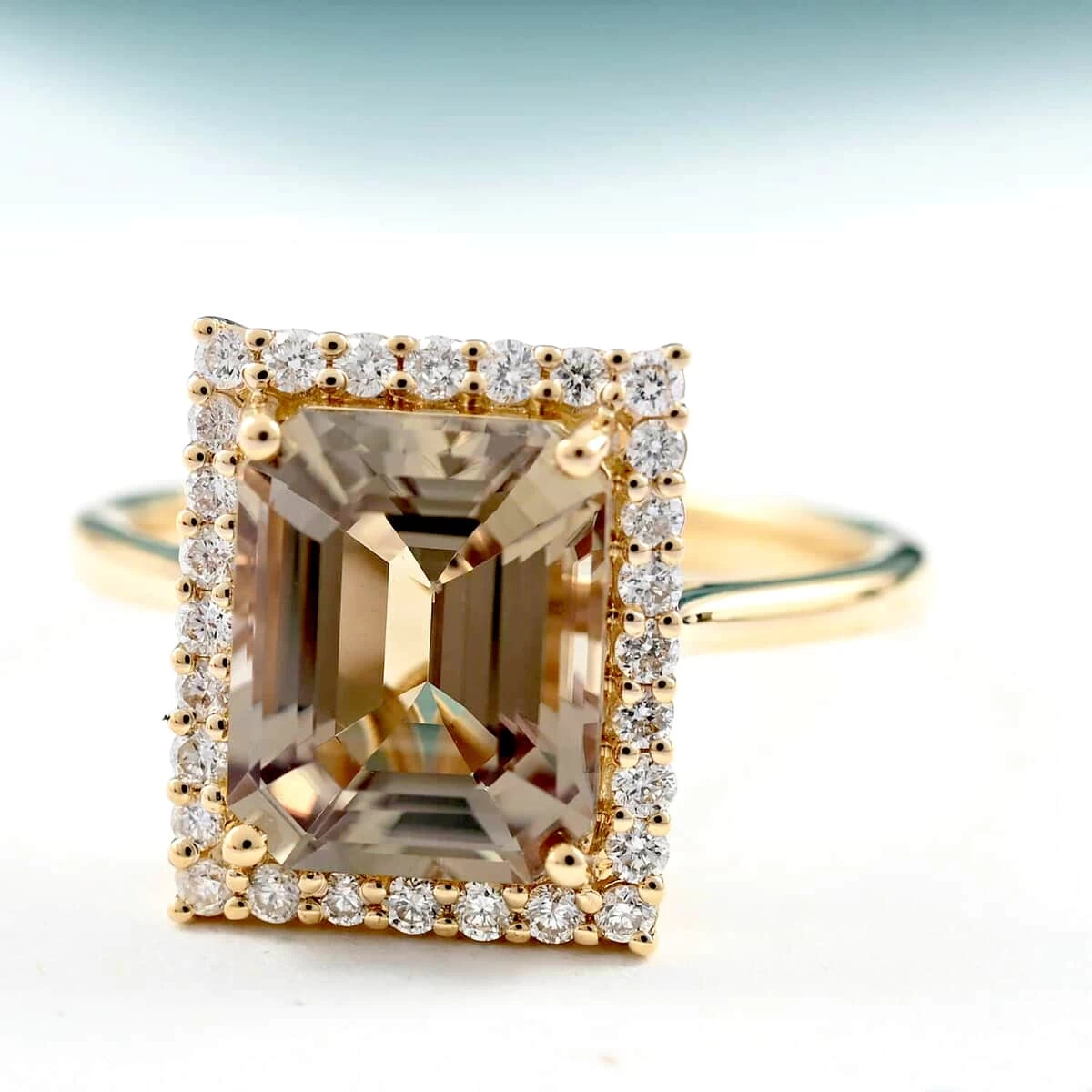 This AAA turkizite ring is inspired by a halo theme. This halo ring features an octagon turkizite in the center. The halo of diamonds around the center gem gives a sparkling look. The prong settings secure the center-certified and appraised gem firmly. The geometrically framed metal displaying the halo design adds a different look. The sleek shank adds minimalism. This turkizite and diamond halo ring have a minimalist look and suits every outfit.