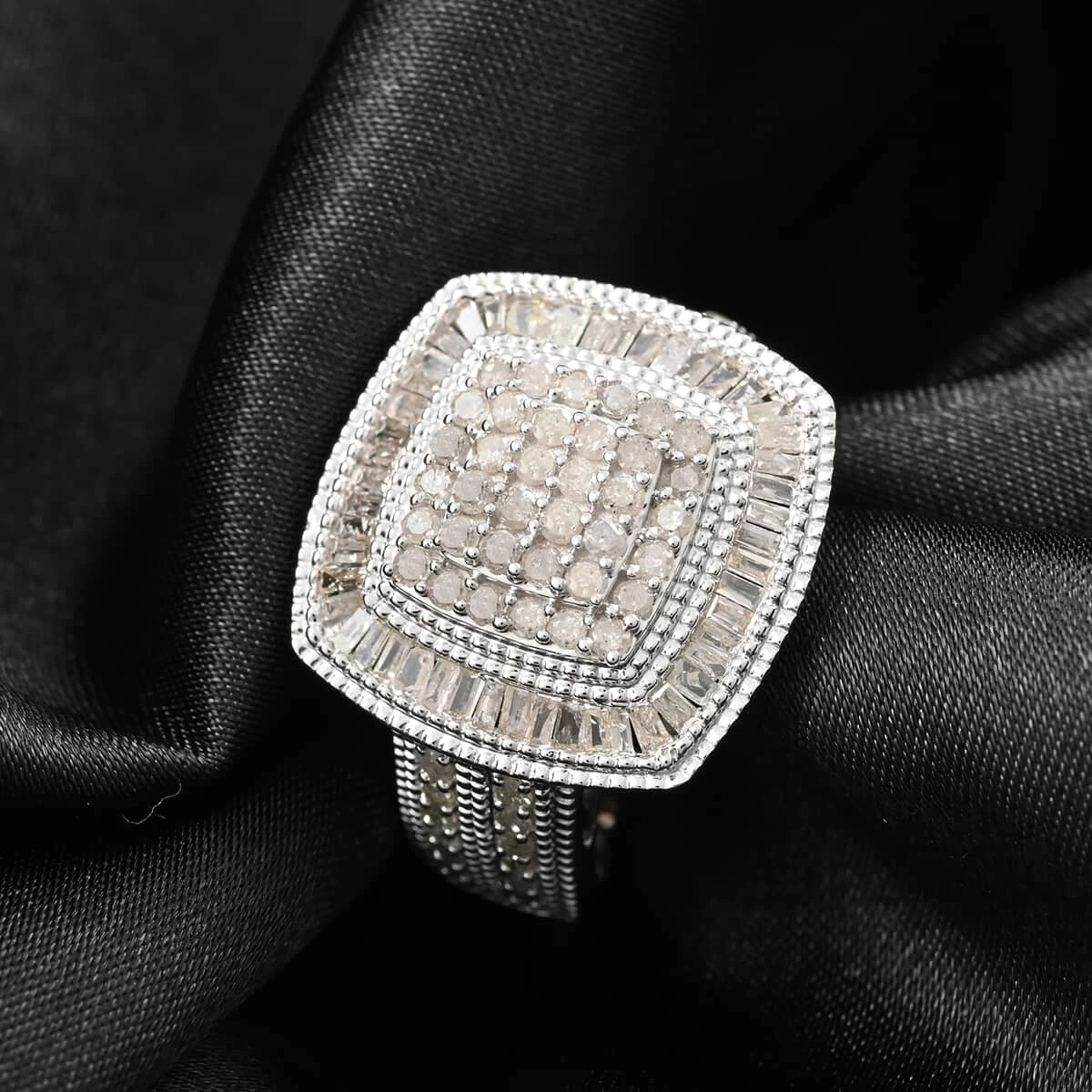 - GEMSTONE DETAILS: This diamond cluster ring features round diamonds in fine-prong settings. The baguette-shaped diamonds are set in a channel giving a clean look