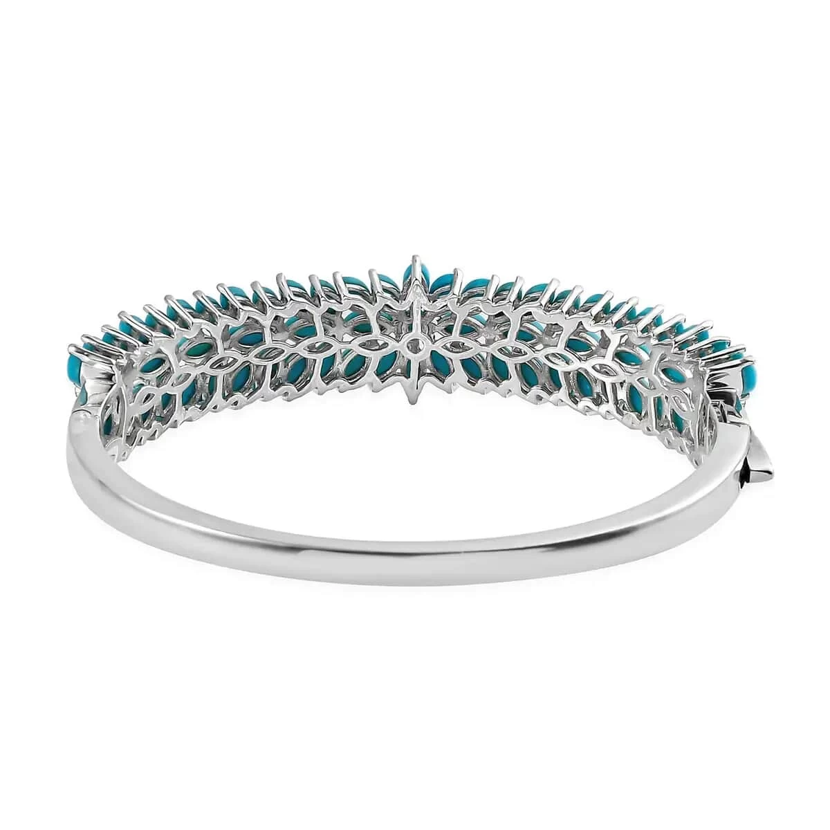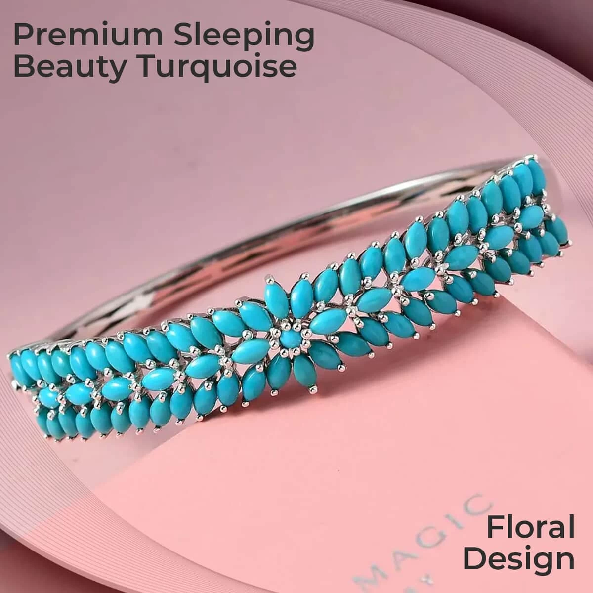 Indulge in a stunning piece of jewelry with this sleeping beauty turquoise bangle bracelet. This sterling silver bracelet features marquise-shaped gemstones in a prong setting, showcasing the striking blue hue of sleeping beauty turquoise. With a press lock clasp, this turquoise bracelet is the perfect accessory to elevate any outfit and add a touch of elegance to your style.
