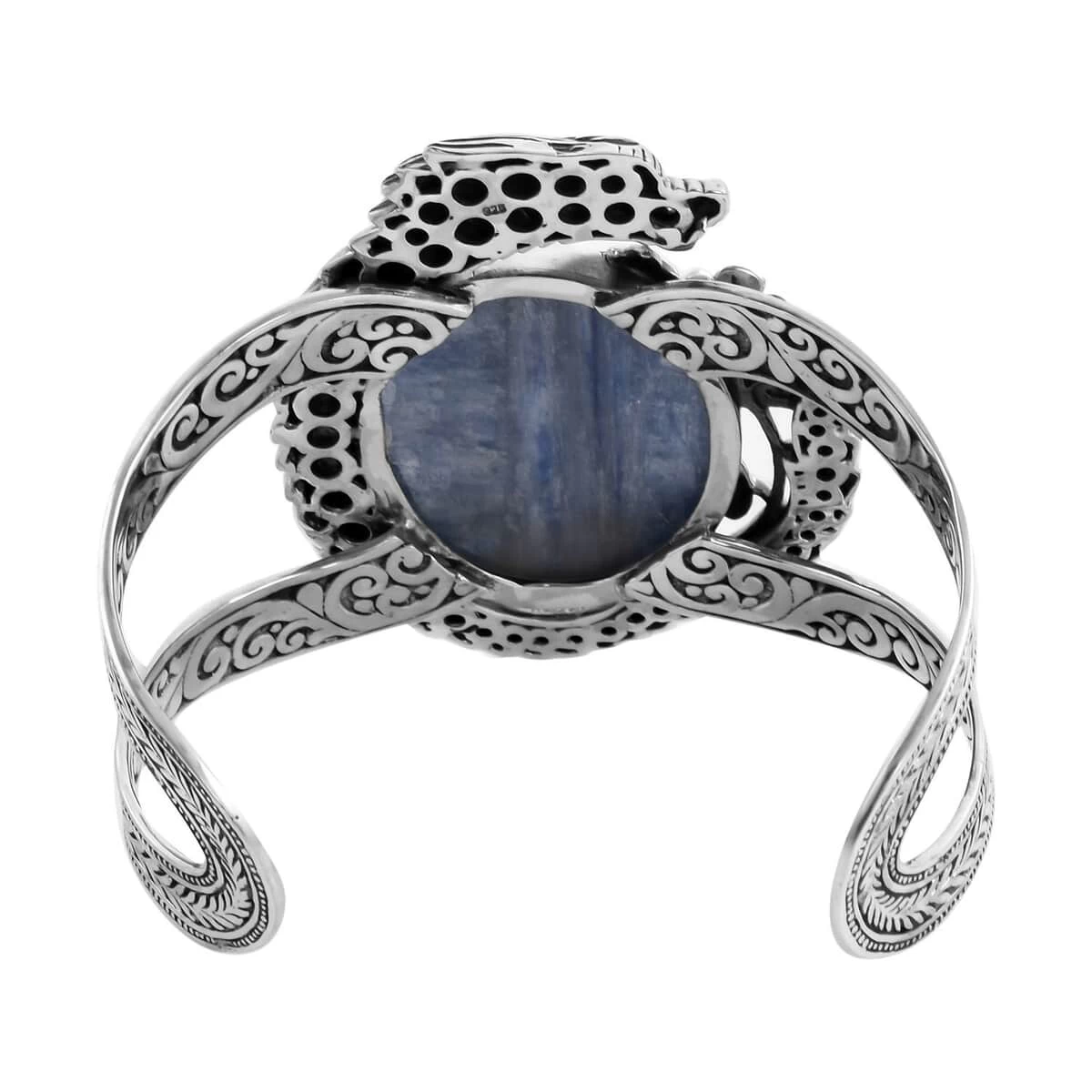 Inspired by the traditional Balinese intricate designs, this Bali Legacy cuff bracelet portrays the finest definition of artistry. This cuff reflects the exotic Balinese and Javanese culture. The metal strands are melted, pressed with a dragon head around a supersized Kyanite right dab in the center. This cuff bracelet is designed in sterling silver, sustaining long-term luster. The metal frame is hypoallergenic and exceptionally durable. The Bali Legacy collection brings forth distinctive handwoven designs offering one-of-a-kind artisanship.