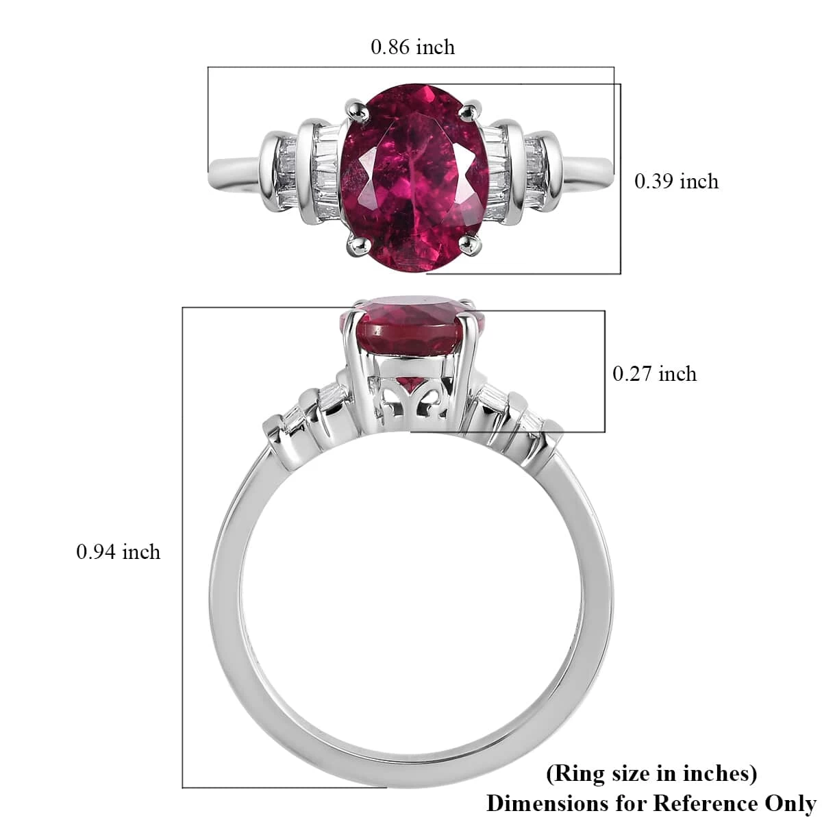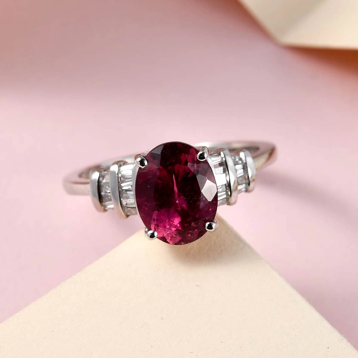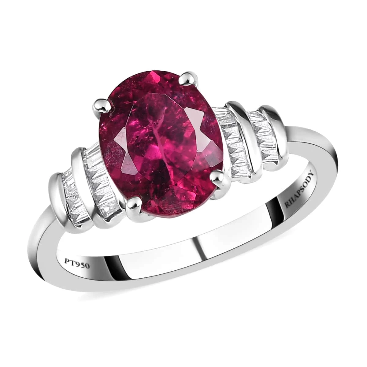 Inspired by the jewelry designs of the Edwardian Era, this AAAA Ouro Fino Rubellite ring symbolizes elegance and sophistication. Edwardian jewelry is known to represent feminism with a pop of color that adds glamor to the outfits, also portraying motifs like bows, ribbons, and flowers. This ring displays an oval-shaped gem in the center held perfectly in a prong setting safeguarding and intensifying the look. The baguette-shaped diamonds on the shoulders of the ring add a scintillating look. Baguette-shaped diamonds are sorted manually and placed firmly with minimal gaps thus maintaining a uniform look. Surpassing every challenge with the one that involves the difficulty in a channel setting of the diamond, this ring comes out to be a perfect piece of jewelry. Rubellites are the second-rarest member of the tourmaline family and are highly prized for their bright hue. Crafted in 950 platinum, this ring from Rhapsody Collection suits all outfits.