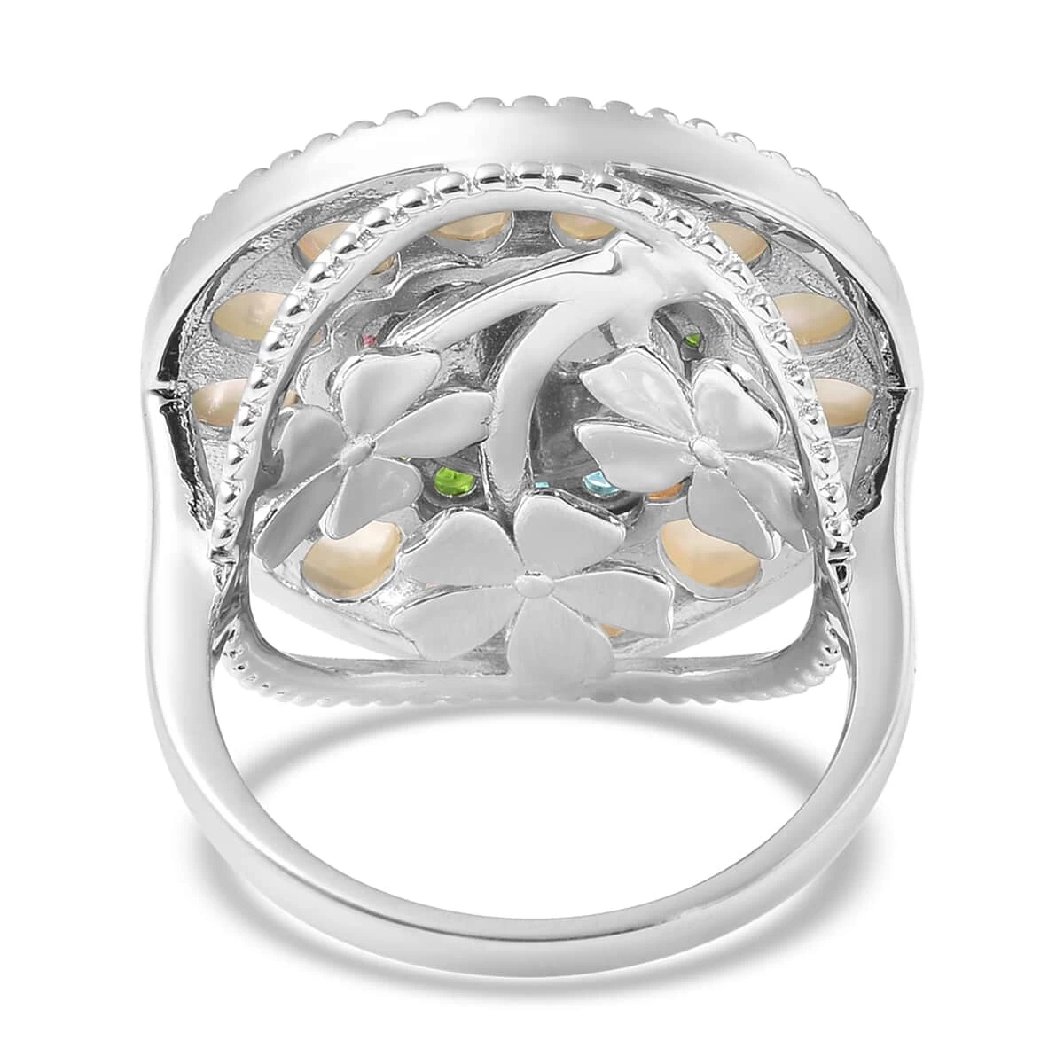 Stand out of the crowd and create your own fashion trend by coordinating this wonderful double circle ring. The subtle metalwork adds a cool spark and artistic appeal to the piece. This halo of multi-gemstones makes this ring look more impressive and attractive.