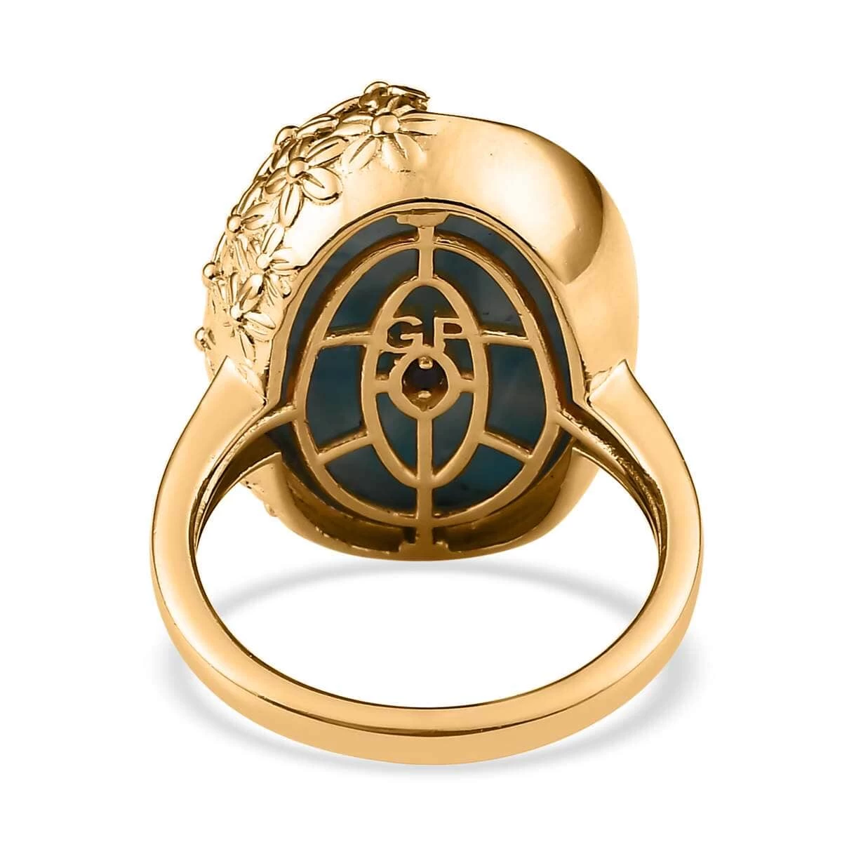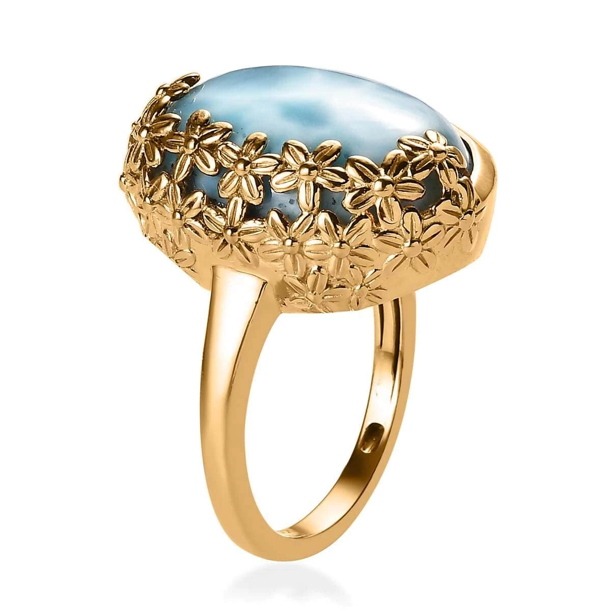 Experience a playful piece of paradise with the GP Italian Garden Collection premium larimar ring. Showcasing a beautifully oval-shaped larimar set in a bezel setting, accented with intricate floral motifs and vermeil yellow gold over sterling silver, this ring is a breathtaking blend of fun and elegance.