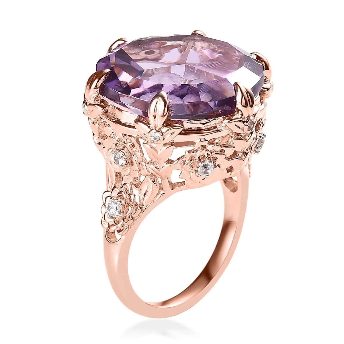 Discover a world of sparkling elegance with our GP Italian Garden Collection rose de France amethyst ring in sterling silver. This creative wonder features an enchanting floral design, artfully crafted with a supersized amethyst and sparkling white zircons. Our unique piece, bathed in vermeil rose gold, brings a pioneering twist to conventional amethyst jewelry, exuding a playful charm that is truly irresistible.
