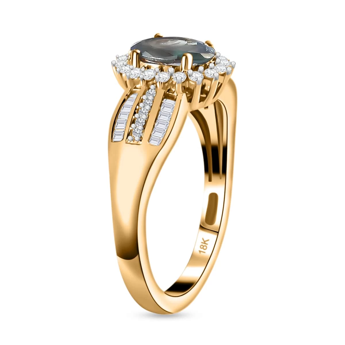 Inspired by the jewelry designs in the Edwardian period, this AAA Narsipatnam Alexandrite ring symbolizes continuity and change. This ring features an oval-shaped gem in the center highlighted by diamonds giving a sunburst halo look. The rows of round and baguette-shaped diamonds flow down the shank giving a scintillating look to the piece. Baguette-shaped gems are arranged precisely with one held in a channel setting giving a uniform look to the adornment. The brilliance exuded by these baguette-shaped gems is excellent adding an intriguing look. Along with the versatility that makes this ring covetable, it’s the quality and high-shine style that makes this ring a unique one. The Alexandrite displays the natural color-changing property where it is emerald by day, and ruby by night. It is the third hardest gem after diamond and corundum and is a rare one, making these earrings stand out from the rest. Crafted in 18K yellow gold, this ring from Iliana Collection can be paired with any outfit.
