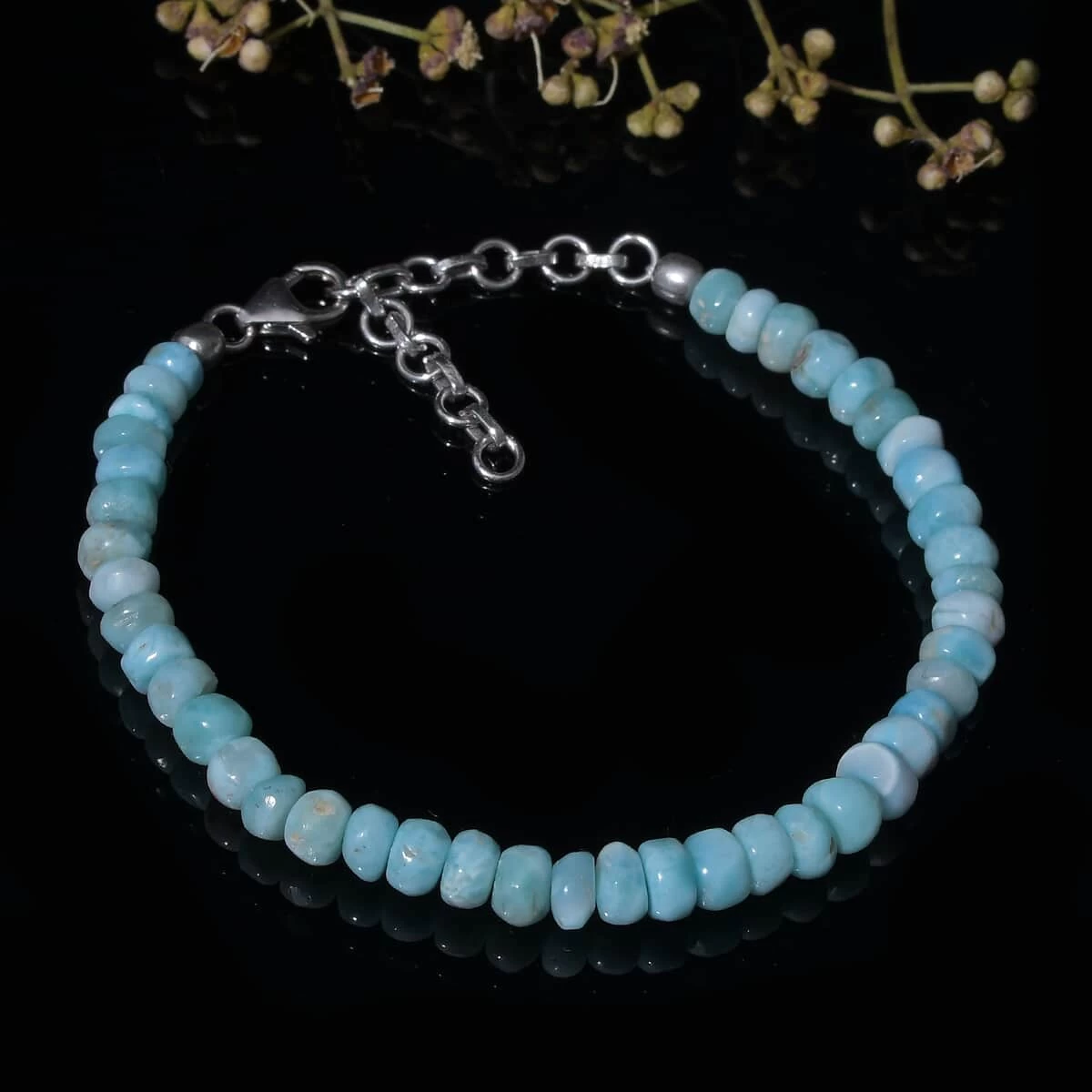 - OCEAN’S WHISPER: Each bead of the larimar beaded bracelet captures the serene tones of the ocean, painting stories of marine romance and intrigue. A true embodiment of oceanic beauty