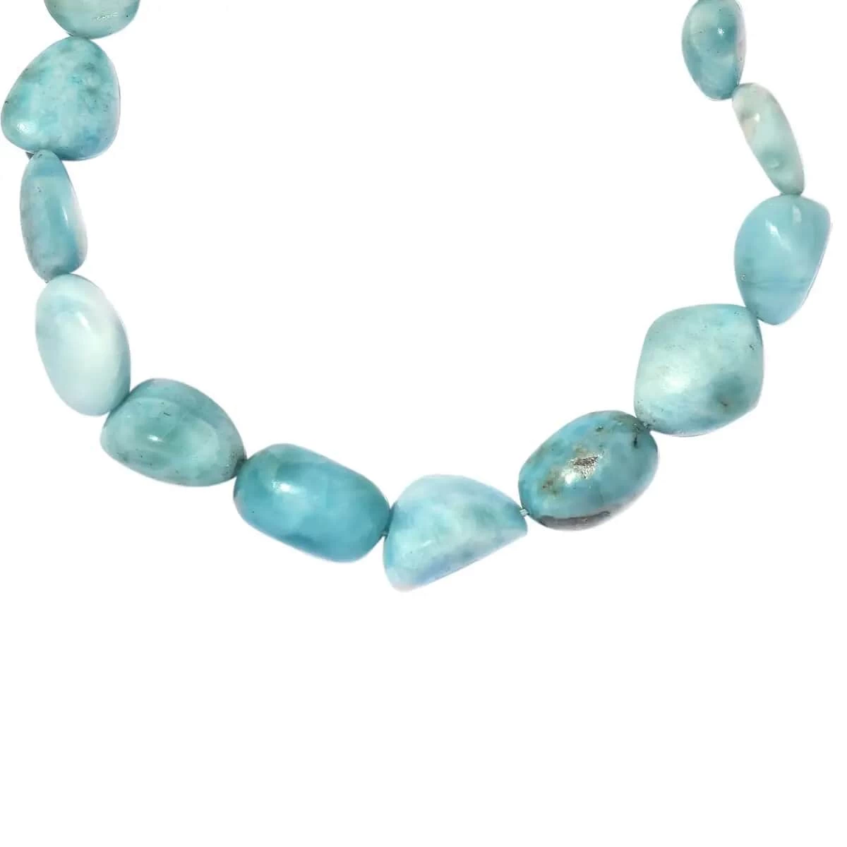 - NATURAL AESTHETIC: The design of the larimar beads celebrates the beauty of raw, natural gemstones. Each bead is tumbled to a soft finish, enhancing its unique patterns and gentle color variations
