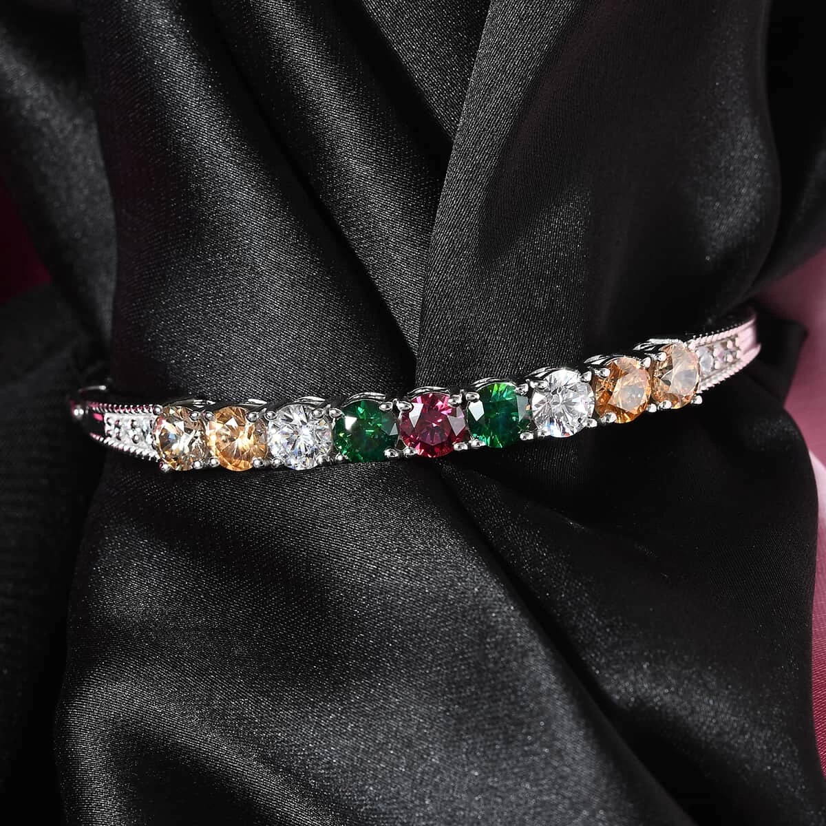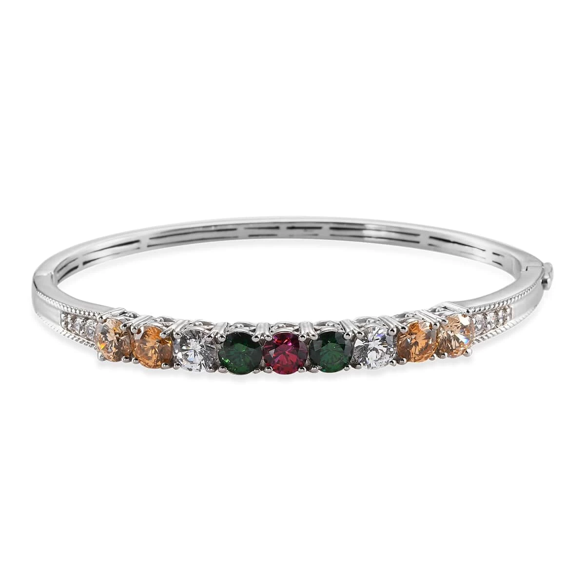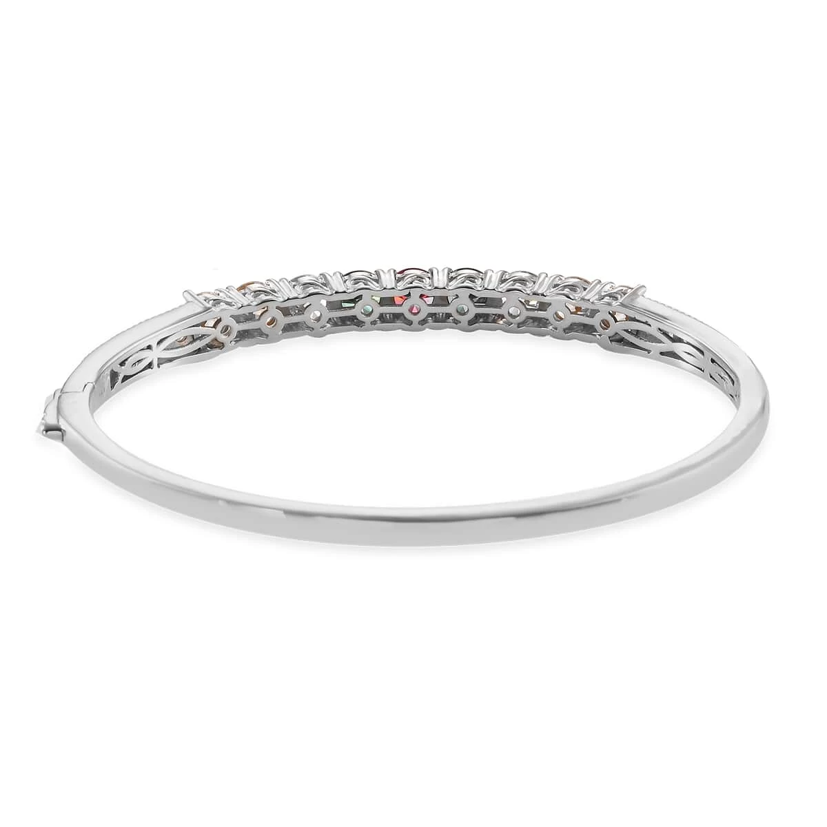 Inspired by the interplay of rainbow hues, this Lustro Stella finest multi-color bangle bracelet adds brilliance to your jewelry collection. Rainbow hues symbolizes hope and transformation in the passage of life. The round zircons are arranged in a symmetrical row, exuding feminine charm from all the edges. The zircons have more brilliance in comparison to diamonds. This bangle bracelet is meticulously designed in sterling silver with a luminous finish, striking a balance of luster and the multi colors. The metal frame is hypoallergenic making it an ideal wear for all skin types in daily rotation. Embrace the elegance of this bracelet to brighten up your personality.