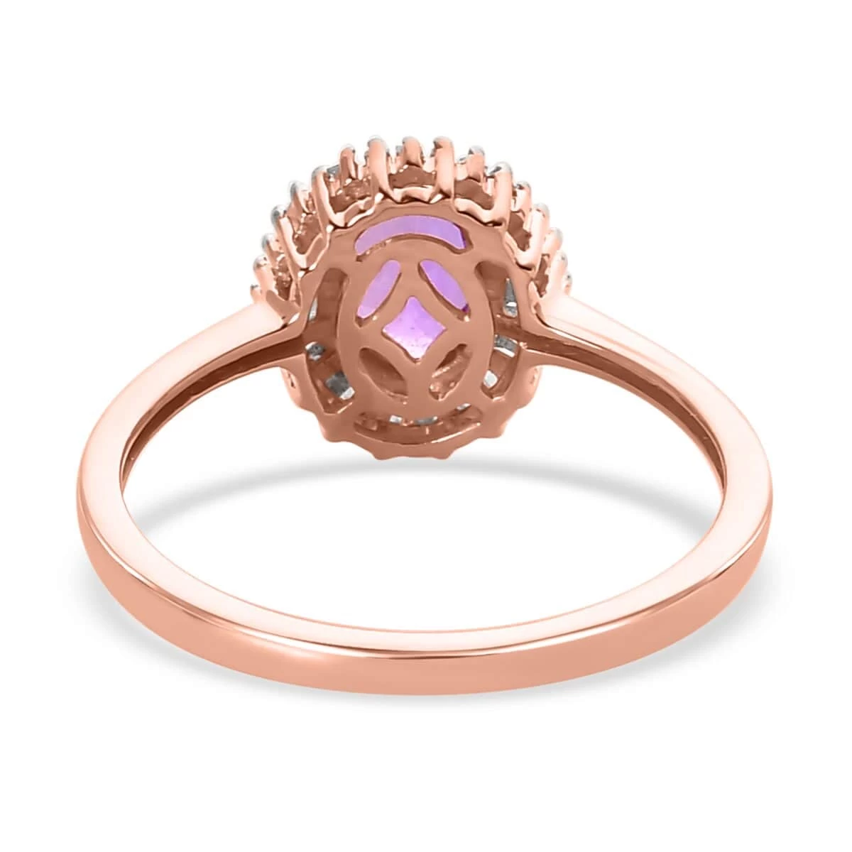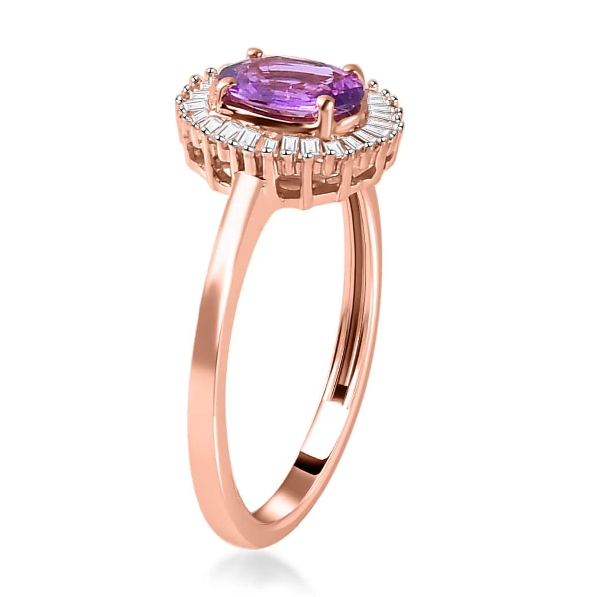This Madagascar purple sapphire ring is a true testament to love and devotion. With a sympathetic touch, this halo ring is crafted to radiate warmth and affection, embracing the emotions that make your heart flutter. Nurtured with care and commitment, it features a beautiful oval-shaped purple sapphire, symbolizing the depth of your connection. The halo of shimmering baguette diamonds further enhances the ring’s symbolism, enveloping it in a loving embrace. Allow this rose gold ring to express the depth of your affection and constantly remind you of the love that binds you.