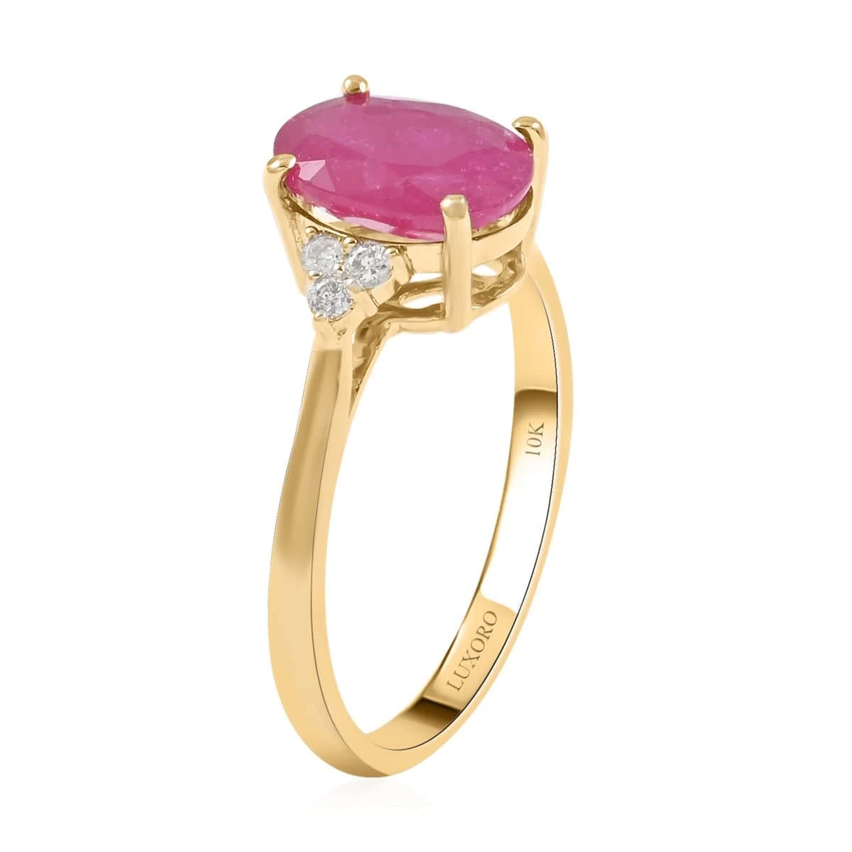 A trefoil pattern inspires this AAA Mozambique ruby ring. This ring features a stunning AAA Mozambique ruby as its centerpiece, surrounded by diamonds that add sparkle and elegance. This ruby ring is crafted in 10K yellow gold. It is durable and complements the gemstones nicely. This ruby gold ring from Luxoro is a perfect choice for anyone looking to add a touch of sophistication and glamour to their jewelry collection.