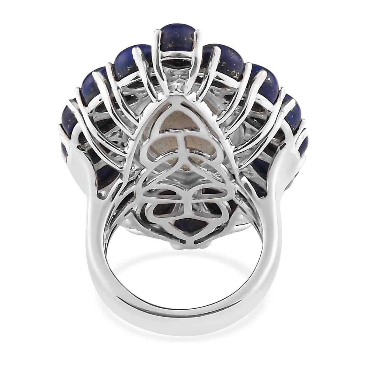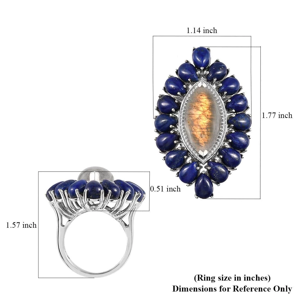 Inspired by a floral design, this Madagascar Fire Labradorite ring signifies joy and happiness. This cocktail ring features a marquise-shaped gem in the center held perfectly by V-shape prongs that safeguard and intensifies the beauty. With a marquise shape gem to be held in prongs is a great challenge to avoid chipping of pointed ends and placed precisely in place. The milgrain beads all over this gem give a halo look. The pear-shaped Lapis Lazuli arrange beautifully around the gray-hued gem representing the petals of a flower. Cocktail rings are popular for their edgy big look that makes the finger look slender. Madagascar Fire Labradorite belongs to the plagioclase branch of the feldspar group. Its metallic luminance called labradorescence can be observed when light hits the stone at an angle, thus making this ring look more beautiful.