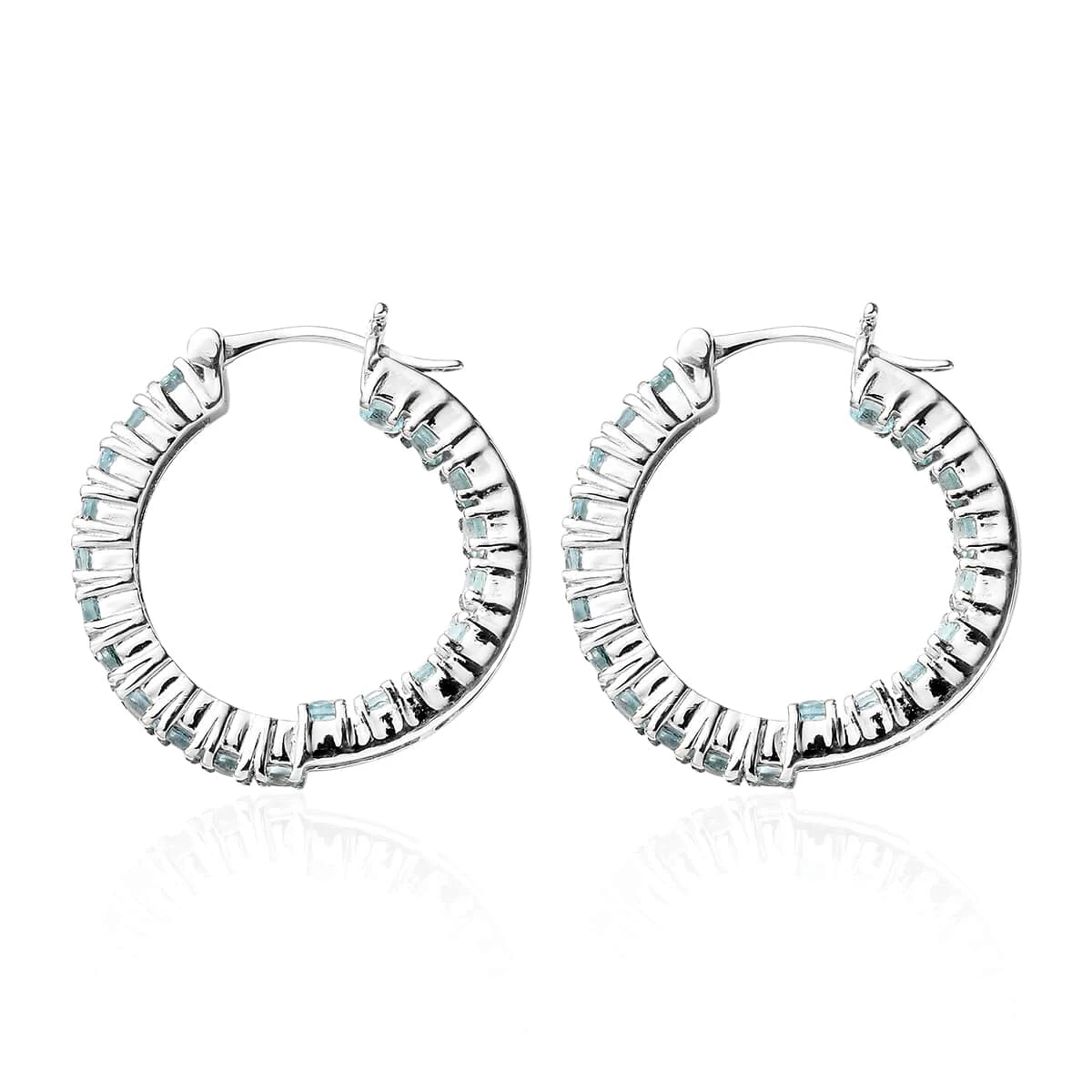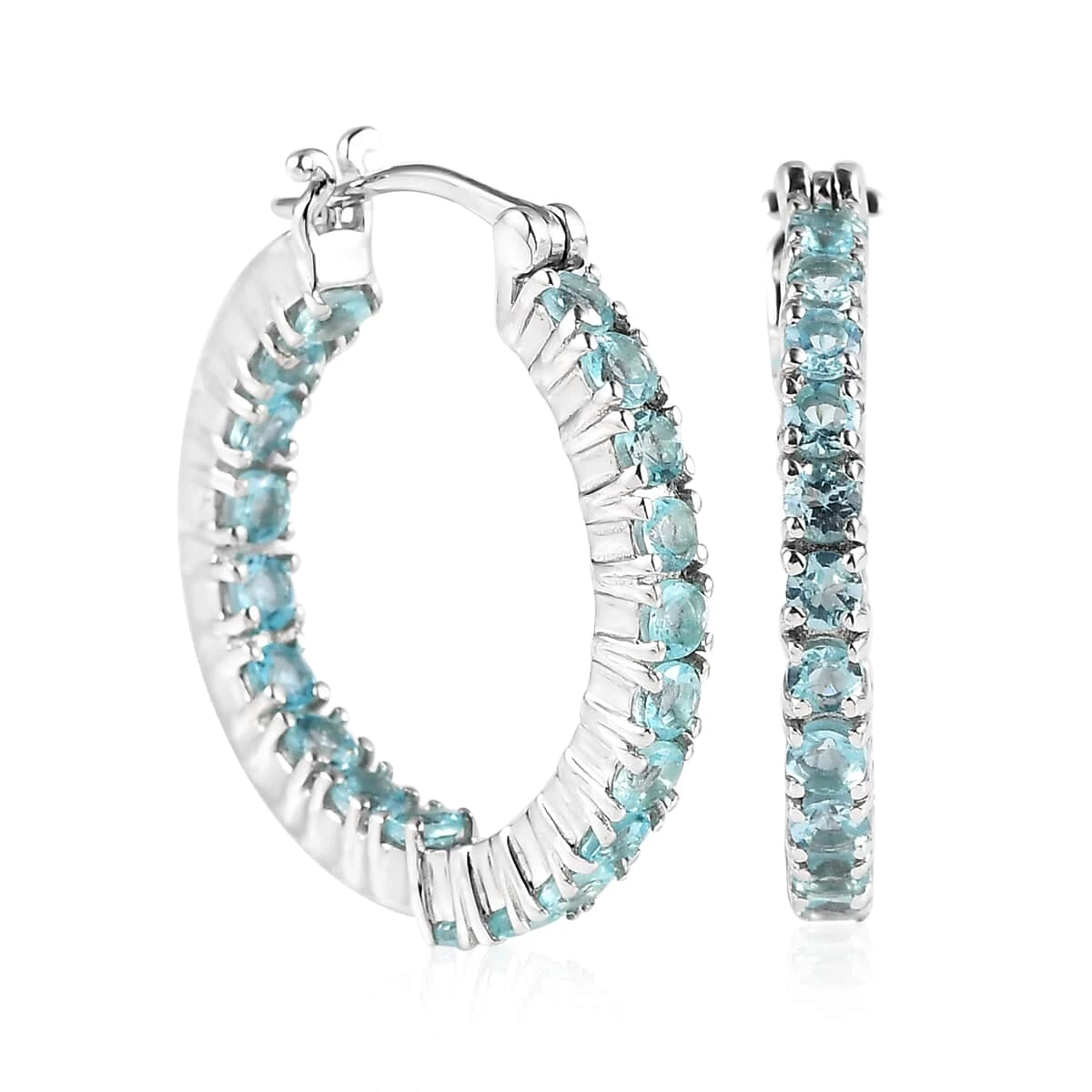Add a dash of effervescent sparkle to your style with the Madagascar Paraiba apatite hoop earrings in sterling silver. These inside-out design hoops exude a radiating beauty that is hard to miss. Enveloped in a luxurious layer of platinum over sterling silver, the exotic apatite stones captivate with their shimmer, making you the cynosure of all eyes.