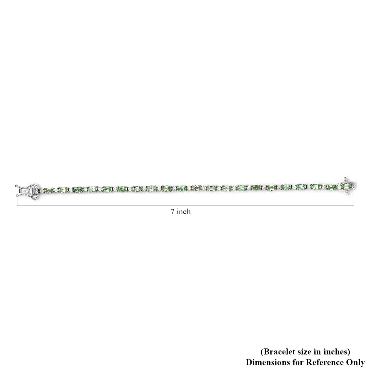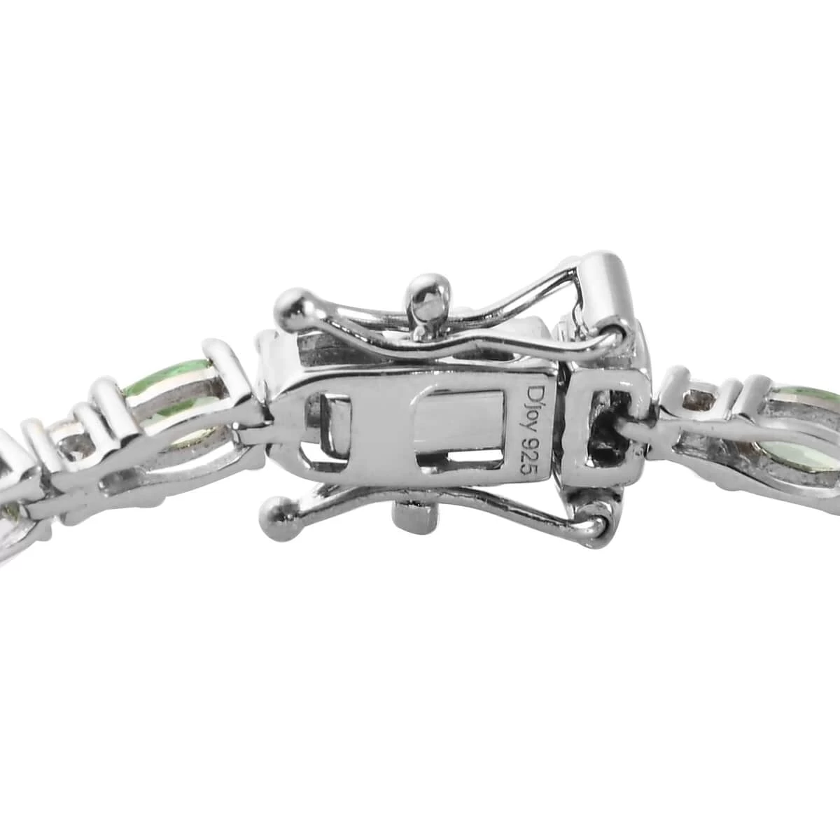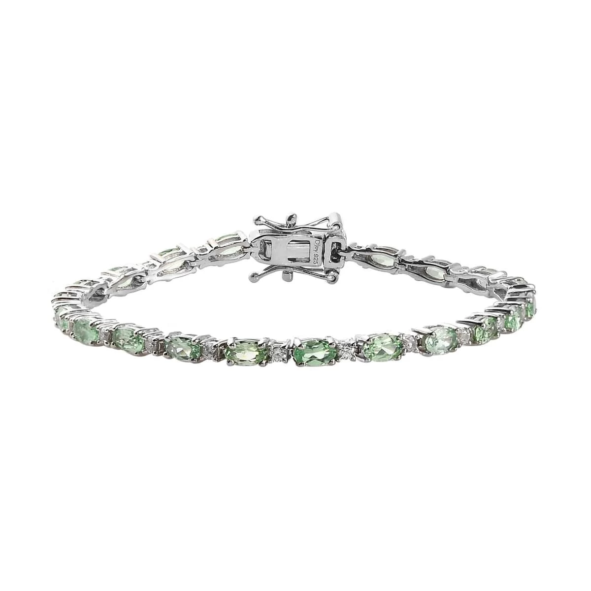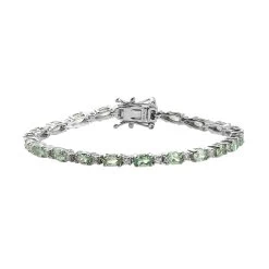 Merelani mint garnet, natural white zircon tennis bracelet is inspired by the fresh mint leaves, signifying a connection with nature. Mint garnets and natural white zircons are finely arranged in a symmetrical loop, exuding brilliance from all the edges of the gemstones. This tennis bracelet is designed in sterling silver with a platinum coating to highlight the fine artistry. The minimal tennis design complements the fancy tab insert clasp with a firm grip. Mint garnets rank seven on Moh’s scale of hardness. Celebrate your exceptional jewelry collection by adding one more exquisite bracelet.