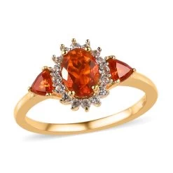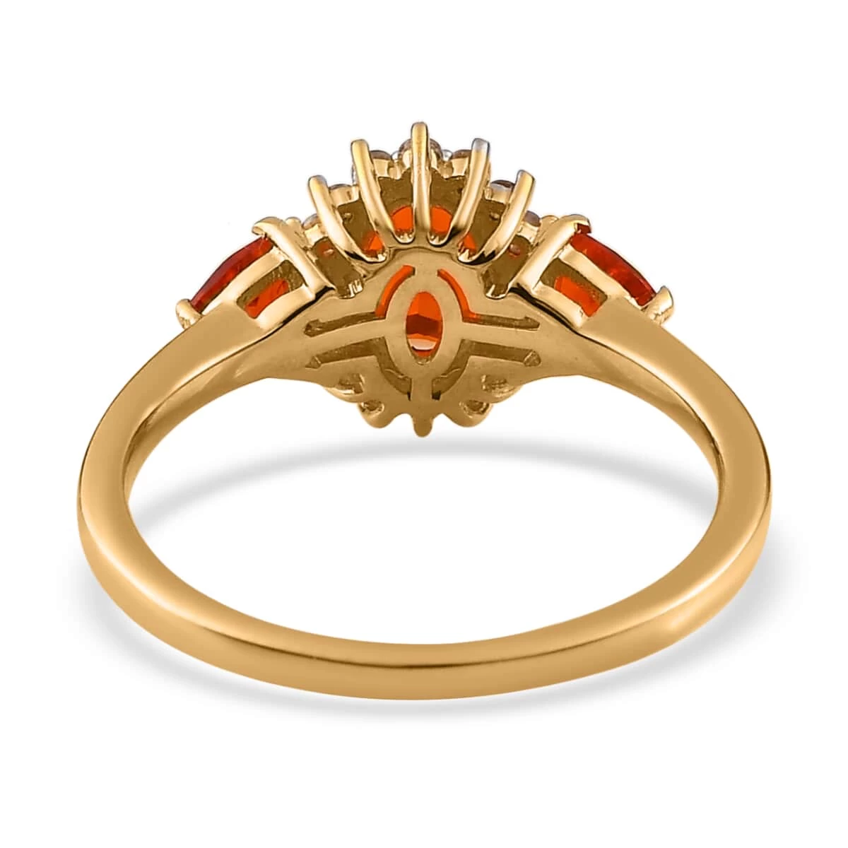 Awaken to the spellbinding allure of the Mexican fire opal ring. Embodying the fervor of nature’s spectacle, this floral ring, with its oval-shaped gemstone encased in a halo of zircons and supported by trillion-shaped companions, is a masterpiece. Cast in vermeil yellow gold over sterling silver, it’s your touch of the ethereal.