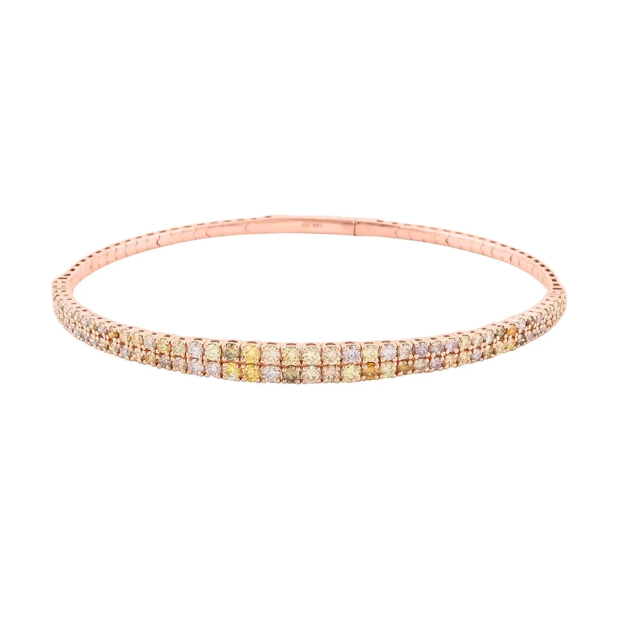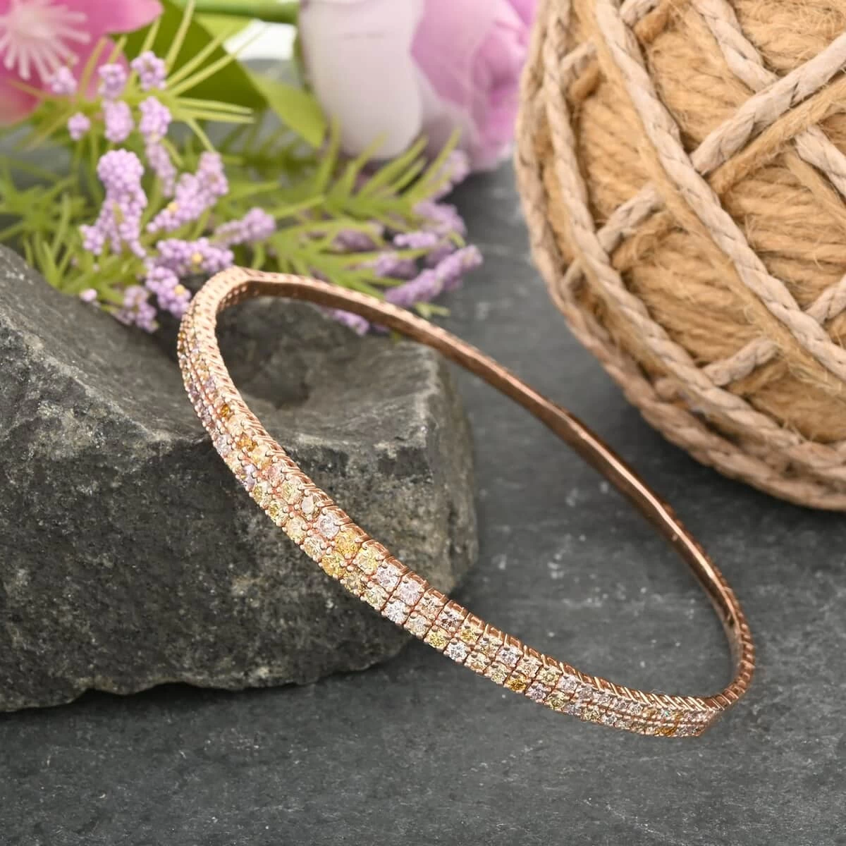 Unveil a world of sheer opulence with this natural multi-color diamond bangle bracelet. A harmonious blend of rose gold’s warm, blush undertones melded seamlessly with the kaleidoscopic dance of multi-colored diamonds. This piece exudes an ethereal aura, making it an emblem of unparalleled sophistication.