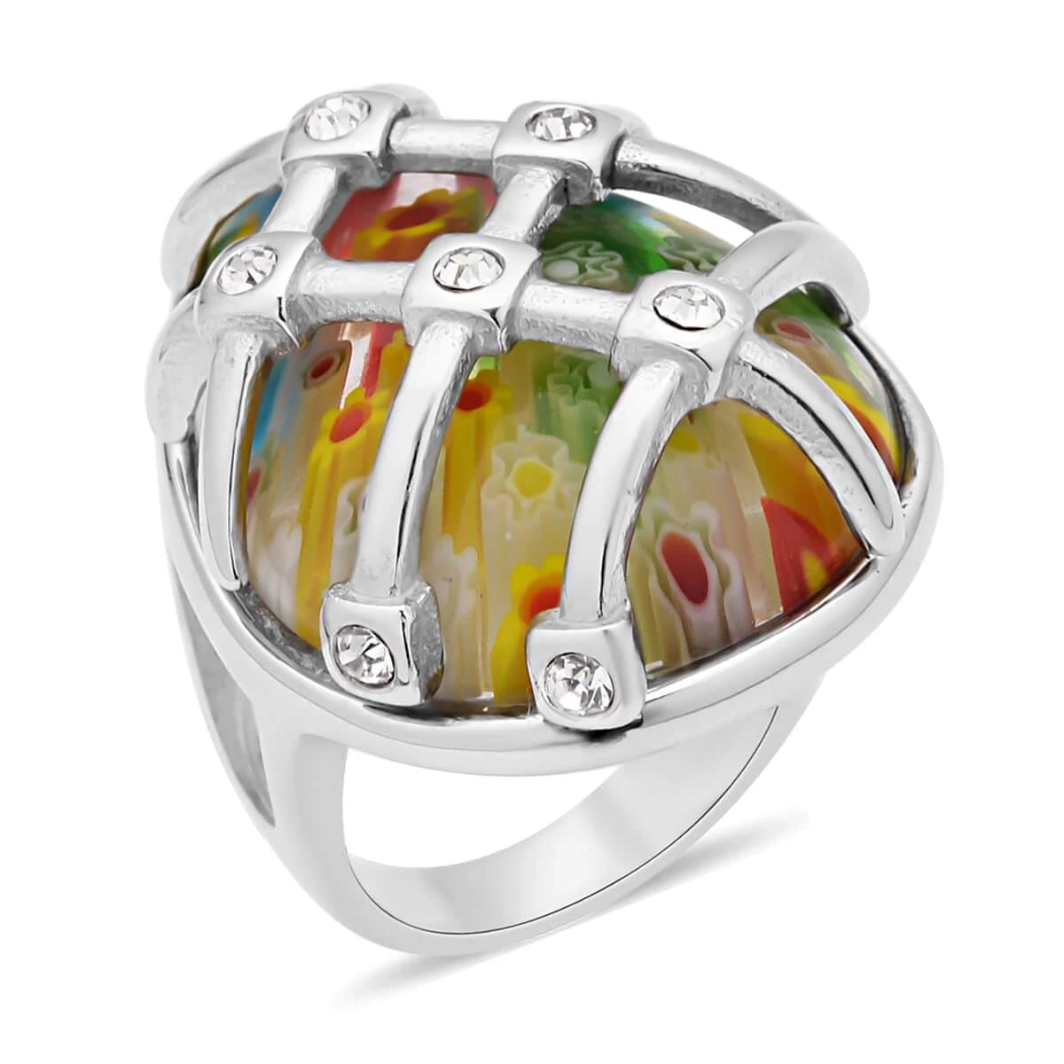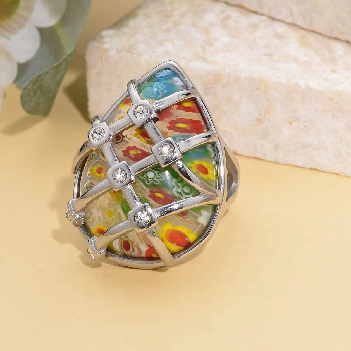 This stunning multi-color Murano style and crystal ring is a true work of art. This ring is crafted with durable metal, featuring a beautiful design made with multiple colorful Murano-style glasses. The glass combines different colors and patterns, adding a vibrant and playful touch to the overall design.