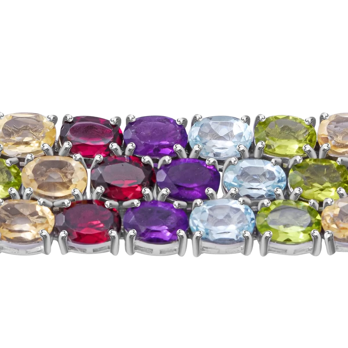 Elevate your style with this stunning three-row bracelet. This exquisite piece of jewelry features a row of vibrant gemstones carefully set in a sterling silver bracelet, creating a dazzling display of color and sparkle. With its timeless design and luxurious materials, this tennis bracelet is a beautiful addition to any jewelry collection.