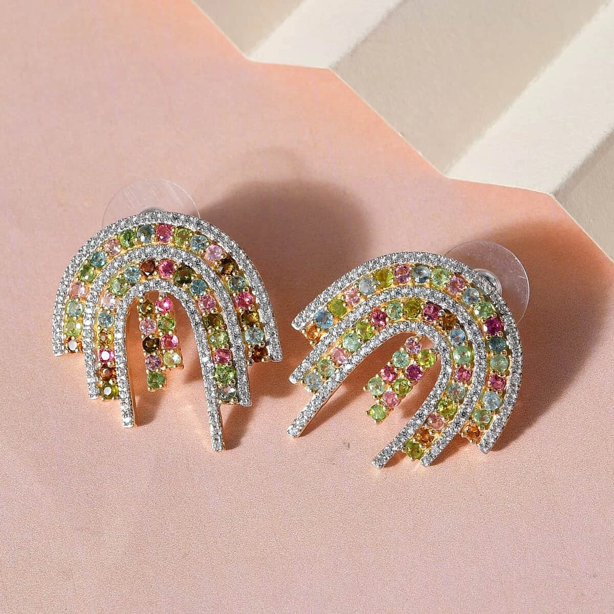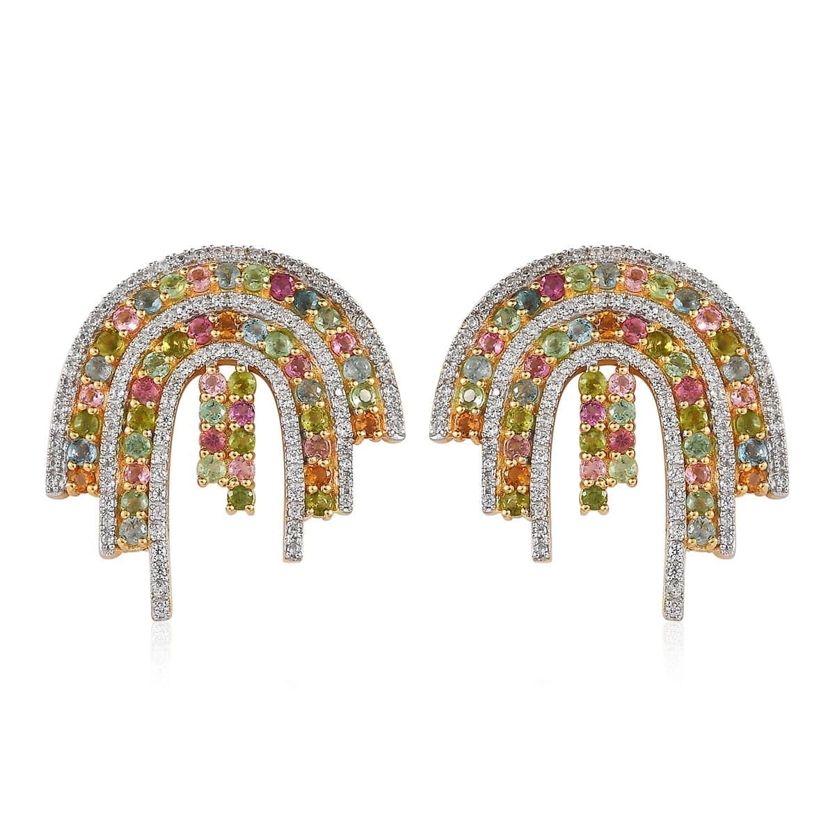 Make an entrance with these intriguing earrings that symbolize a sign of hope, the beauty after the storm, a pot of gold, and good fortune at the rainbow’s end mind and soul. These round-cut rainbow-designed earrings gleam in multi-colored and white zircons that encapsulate the natural charm of vibrant colors. The rainbow design makes the pull-back closure on ends allow easy gripping of earrings to the earlobes as they swing in vermeil yellow gold over sterling silver.