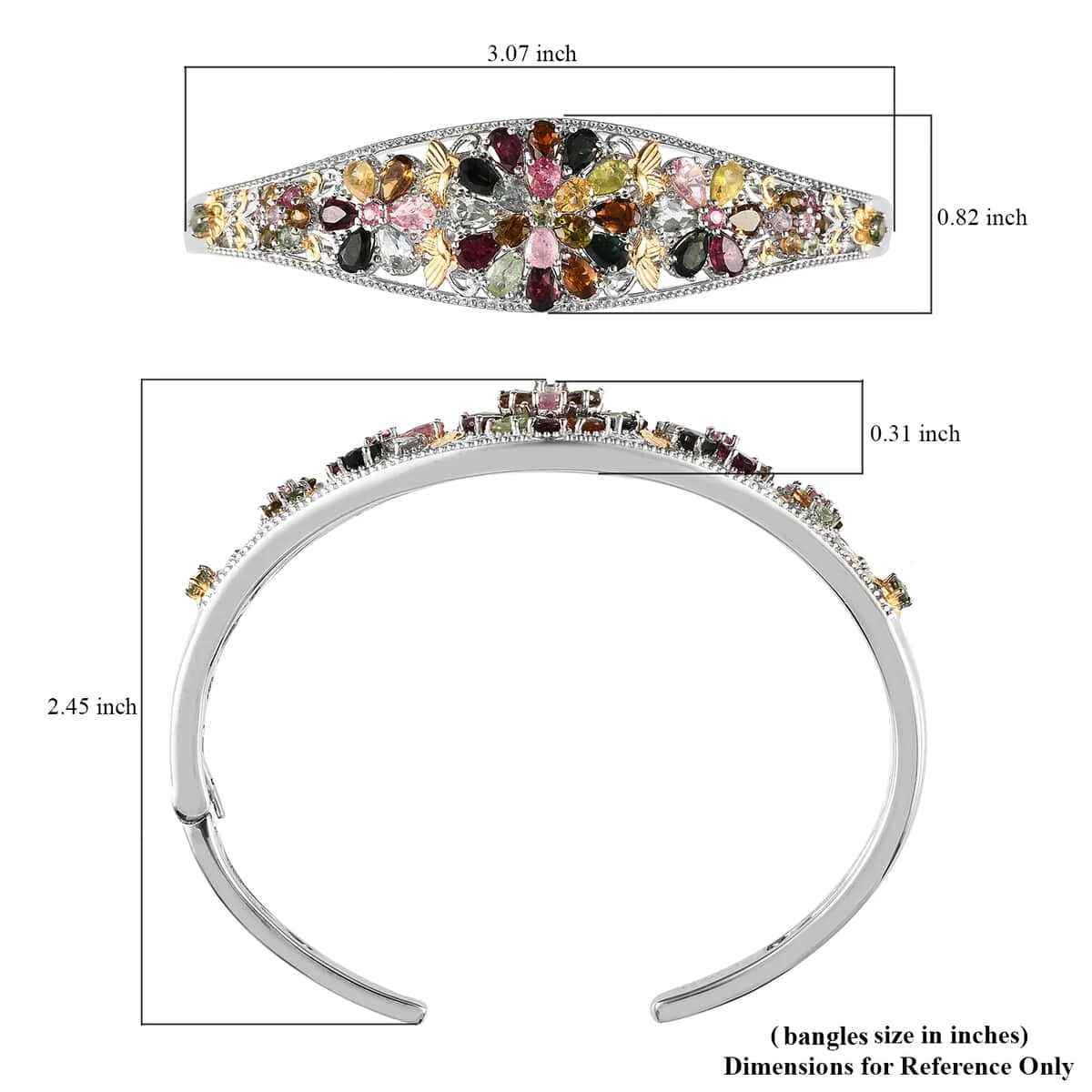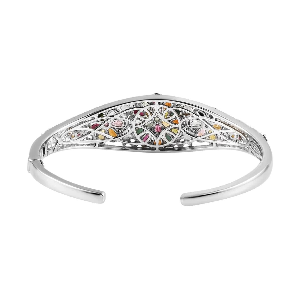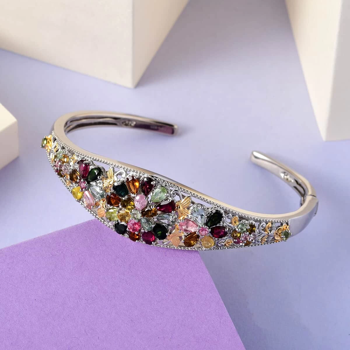 The multi-tourmaline cuff bracelet resonates with the floral theme. The multi tourmalines are encrusted in floral designs, with the bigger ones in the center and two small same-sized ones on both sides. The floral theme-based multi-tourmaline bracelet is crafted in sterling silver with a vermeil yellow gold coating to highlight the majestic hues of the gemstone. The flower pattern on the bracelet frame gives a powerful feminine appearance to the cuff bracelet. The floral theme symbolizes peace and tranquility in the passage of life.