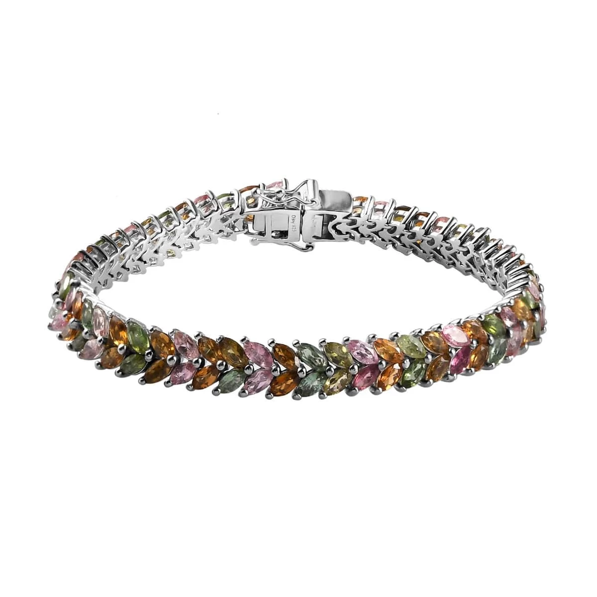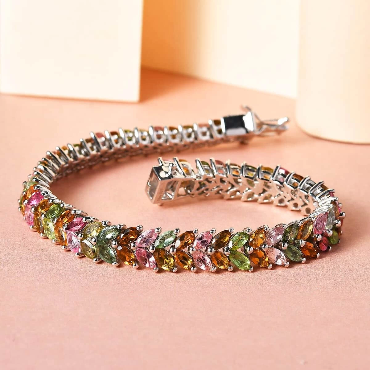 Inspired by the barley spikes, this multi-tourmaline double row bracelet creates an aura of majestic hues of the gemstones. Barley spikes symbolize abundance of prosperity. The nature inspired design gives a timeless touch to this multi-color bracelet. The relentless perfection of design lies in the shaping of each multi tourmaline into marquise. The symmetrical arrangement of the multi tourmalines allows all the light to shine from different directions with minimized space. The iconic prong setting of the gemstone keep them close and props up the gemstone, adding to the brilliance. The sleek curves of the gemstones magnify the exquisiteness of the design. This double row bracelet is meticulously designed in sterling silver with a luminous finish, illuminating the bracelet with luster. The hypoallergenic property makes the tourmaline bracelet an ideal wear for all skin types. The fancy tab insert clasp adds a style element to the bracelet with an essence of comfort and smoothness. This 100% natural gemstone is offered with rare shades that arranged to strike a balance of color combination.