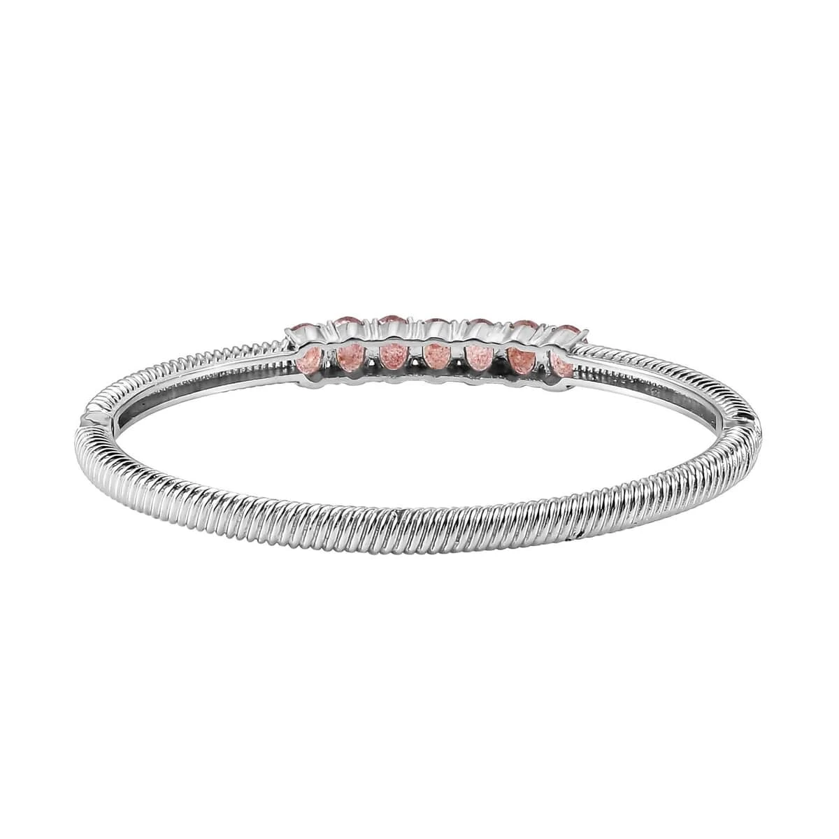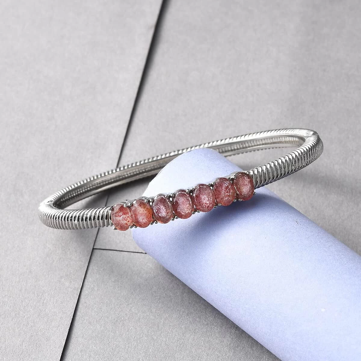 Inspired by the minimalist theme, this natural Tanzanian natronite bangle bracelet has a refined and subtle appearance. Minimalist theme symbolizes the fashion of taste and elegance. Natronite is embellished in a symmetrical row, reflecting pink hues of the gemstone. The metal strands are twisted and pressed to give an intricate design on bracelet’s frame. This bangle bracelet is designed in a sturdy metal, highlighting the luster of the bracelet. The metal frame is hypoallergenic and offers long-term durability to the bracelet. This bracelet is an ideal wear with your casual outfits in daily rotation.