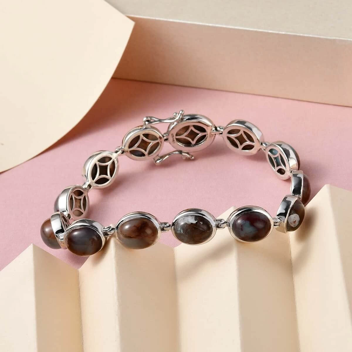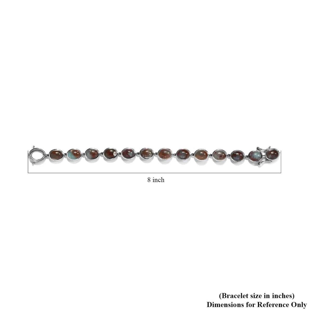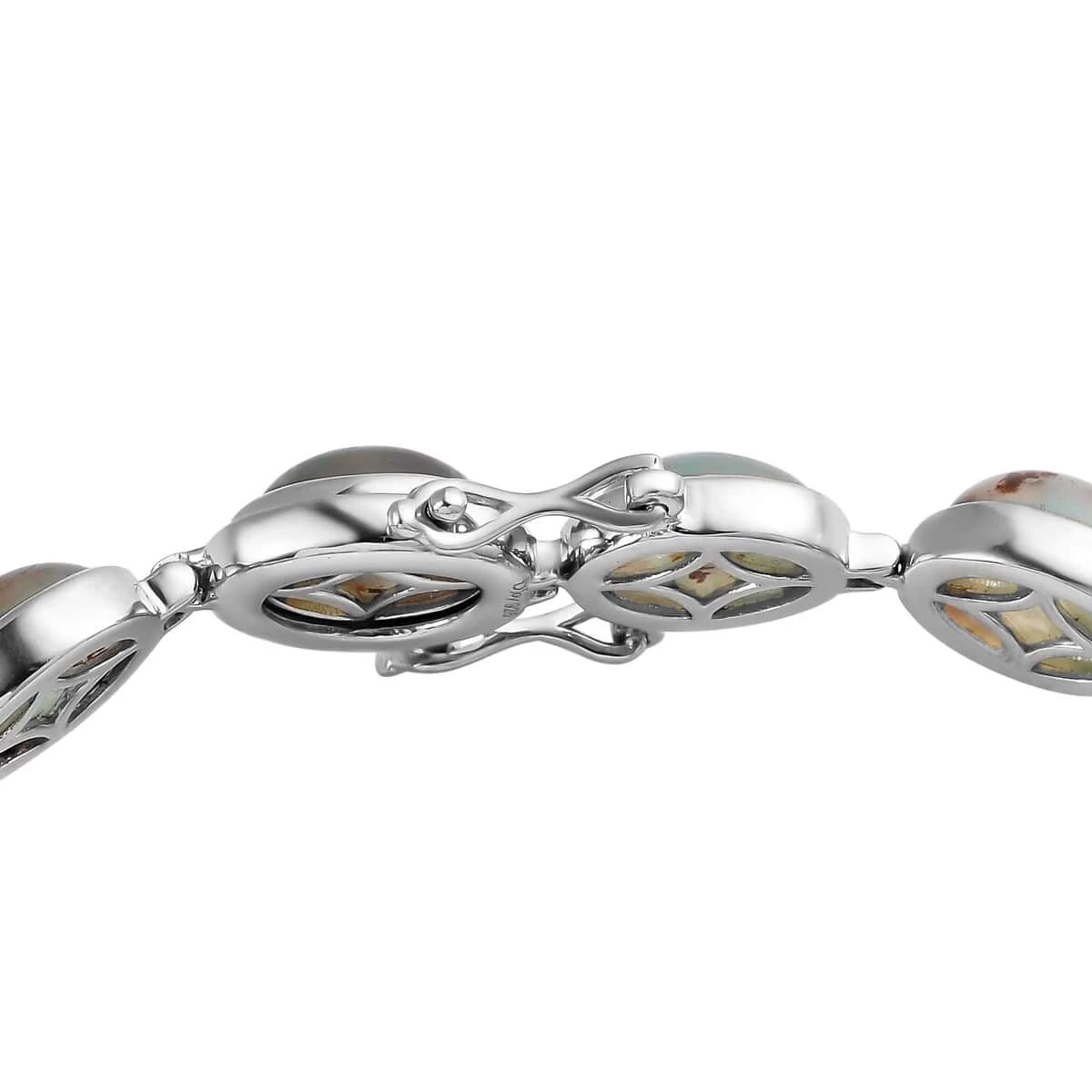 Inspired by the minimalism theme, this zimbaprase bracelet is the finest definition of grace and elegance. Minimalism theme symbolizes the pursuit of simplicity with an essence of sophistication. The gemstones are placed in a uniform sequence. The elegant links connect each gemstone, giving a detailed appearance to the design. Zimbaprase is a rich bluish green chalcedony with a fine blend of white and brown veining. The artisans have carefully sorted and polished the gemstones to sustain uniformity with fine cut and defined structure. This bracelet is intricately designed in sterling silver, featuring smooth texture and rich luster. The metal frame is hypoallergenic making it a convenient choice of adornment with a fine blend of fashion. The tab insert clasp offers a secure closure with a firm grip.
