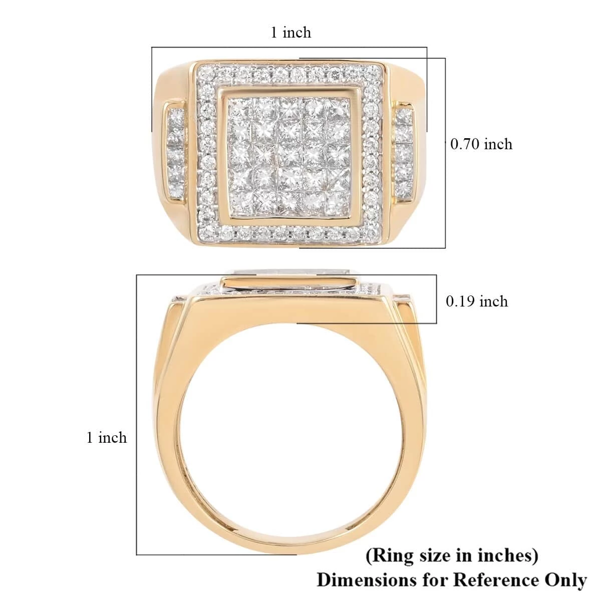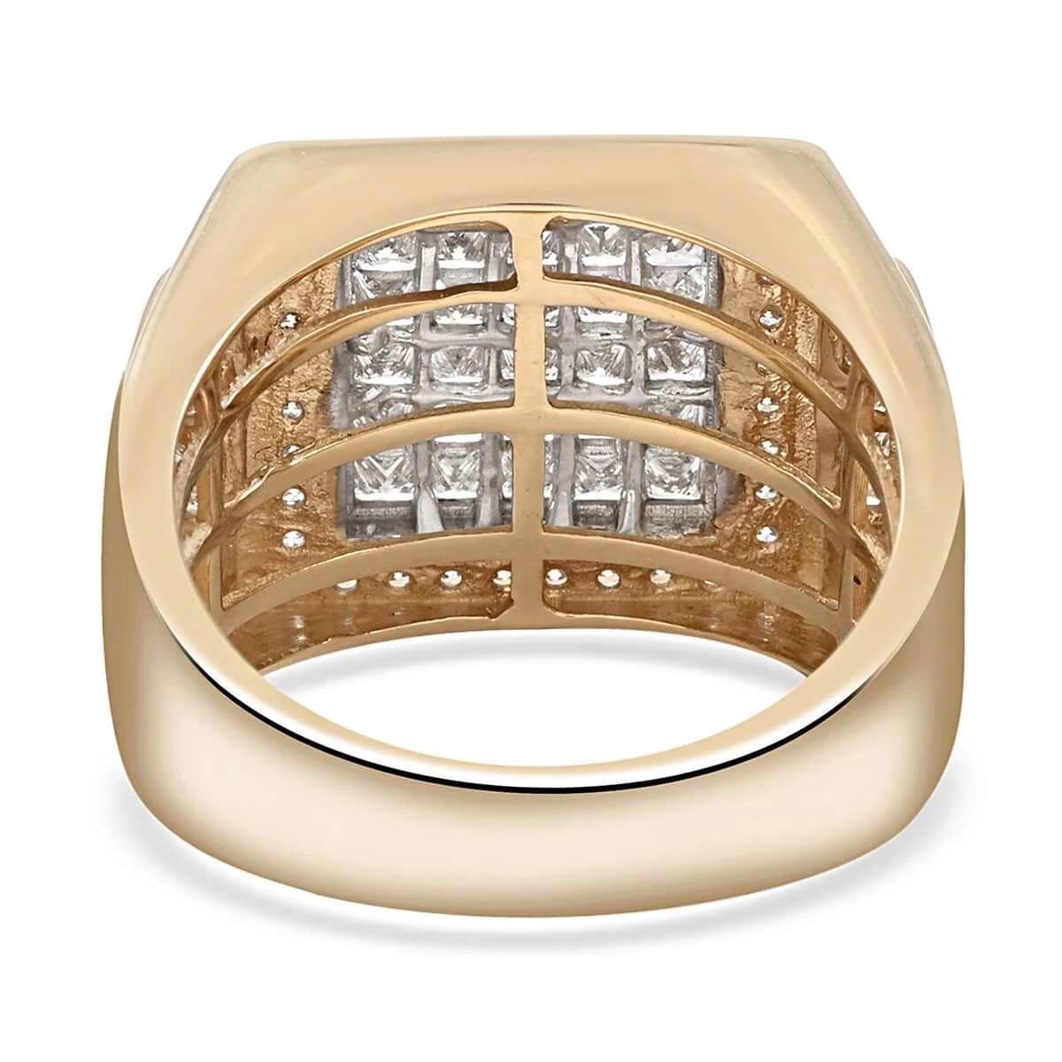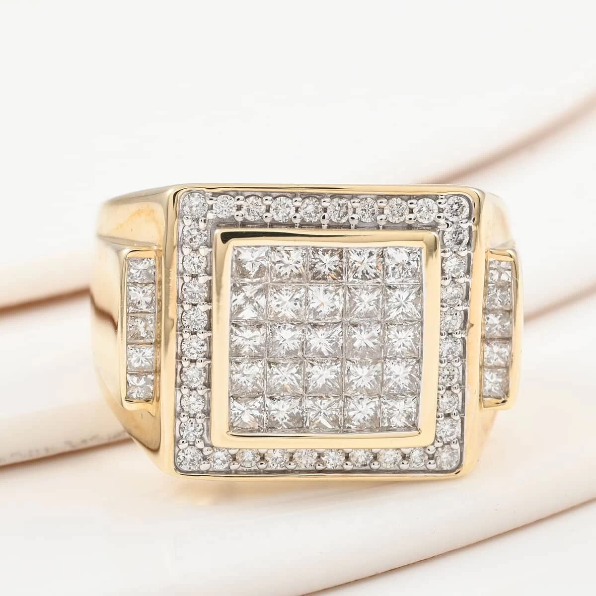 Inspired by art deco, this diamond men’s ring symbolizes wealth and sophistication. This ring features square-shaped gems arranged in a square frame, each well-set in an invisible setting giving a clean and uniform look. The center clustered arrangement of the sparkling gems makes it look like a single super-sized gem. The round diamonds encircle this square-shaped pattern giving a halo appearance. Adding onto a scintillating look to the ring, the square-cut diamonds on the shoulders offer more brilliance and fire. The sturdy and wide shank balances the overall radiance. An heirloom gem that can be passed on to generations, diamonds are considered an expression of everlasting love. Art Deco, an era of jewelry prevalent during 1915-1935 commemorates the glamor, luxury, and technological advances of that time. Crafted in 10K yellow gold, this men’s ring is perfect for everyday wear owing to the great hardness of the gem.
