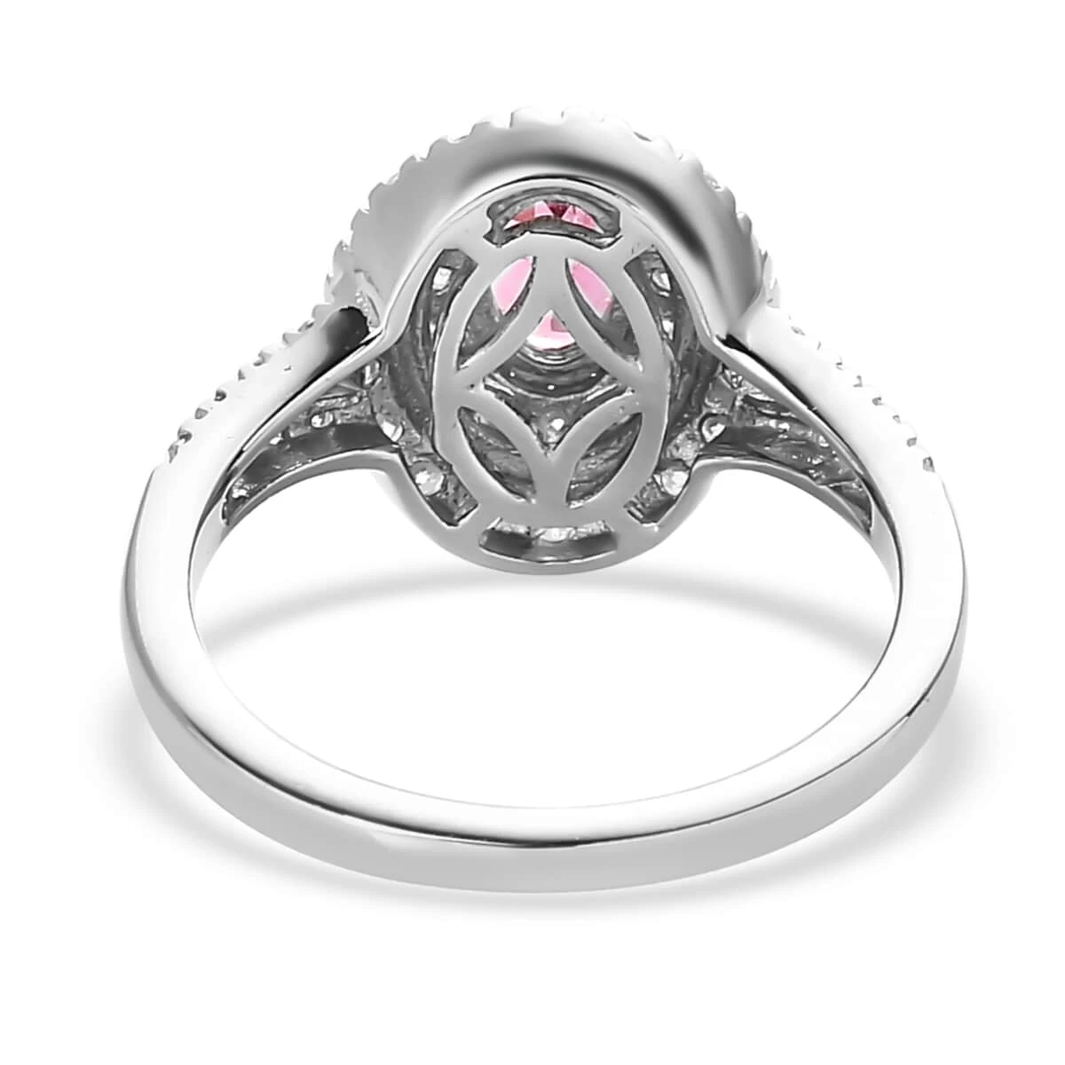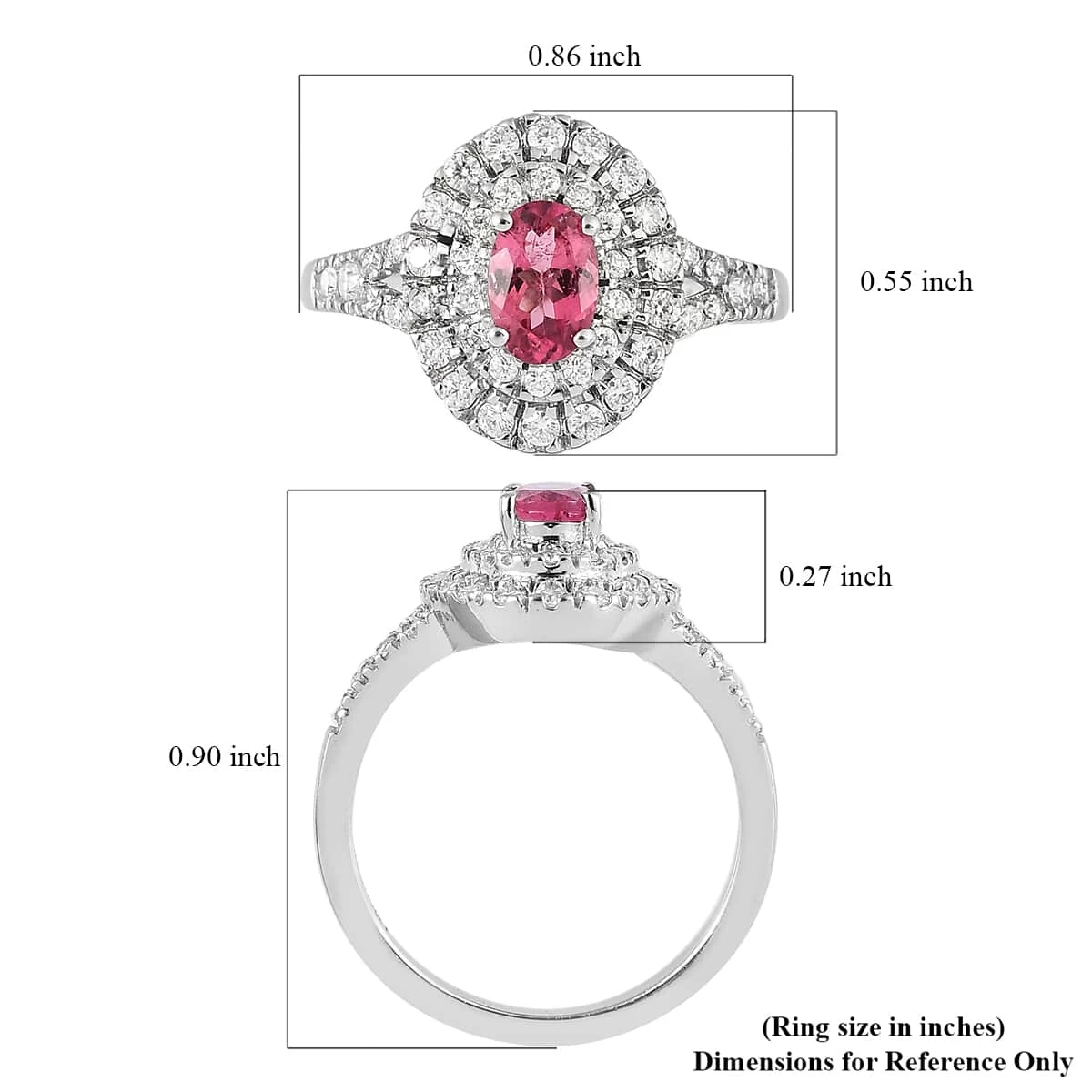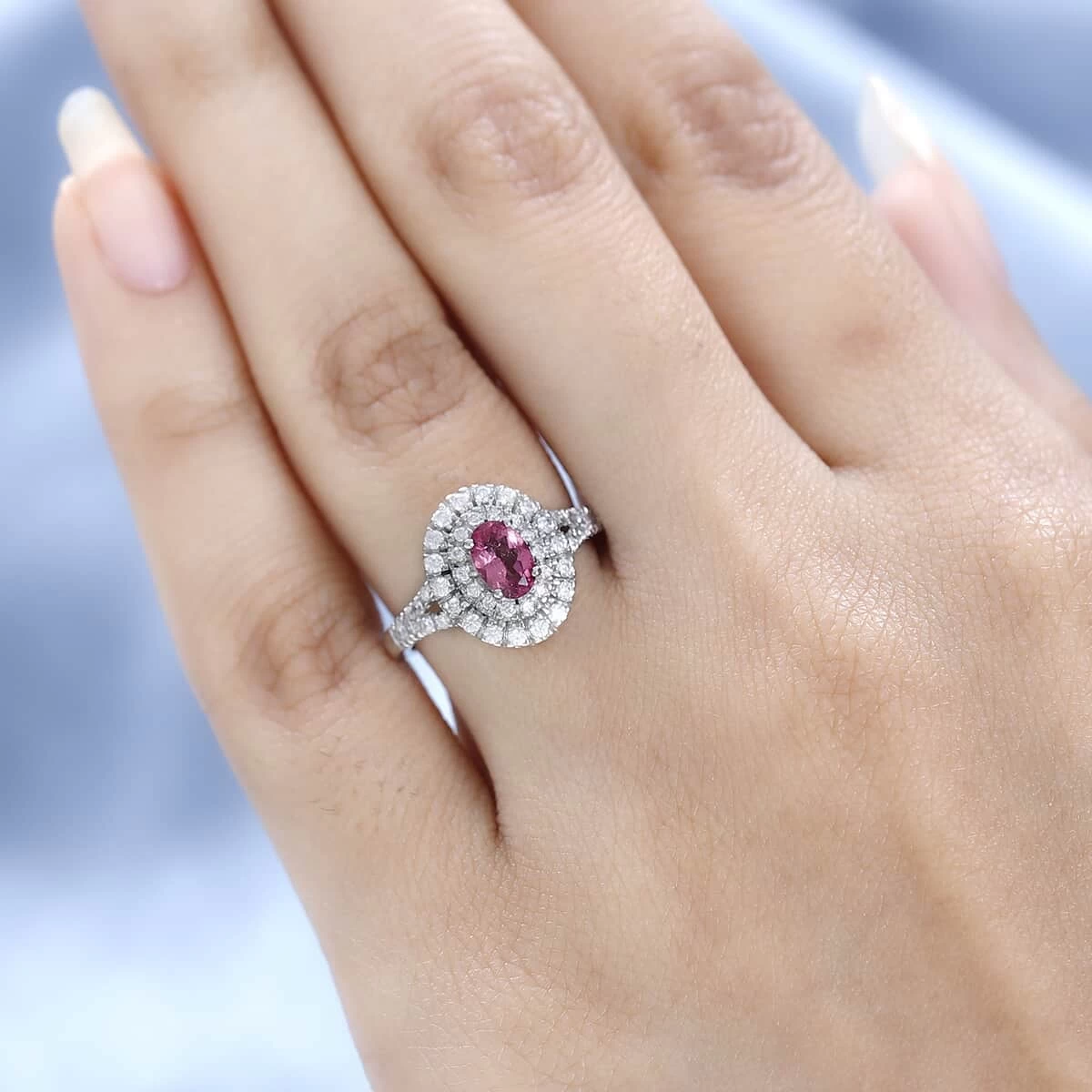 - DOUBLE HALO DELIGHT: The oval-shaped rubellite is encircled by a double halo of glittering moissanites, enhancing its radiant allure