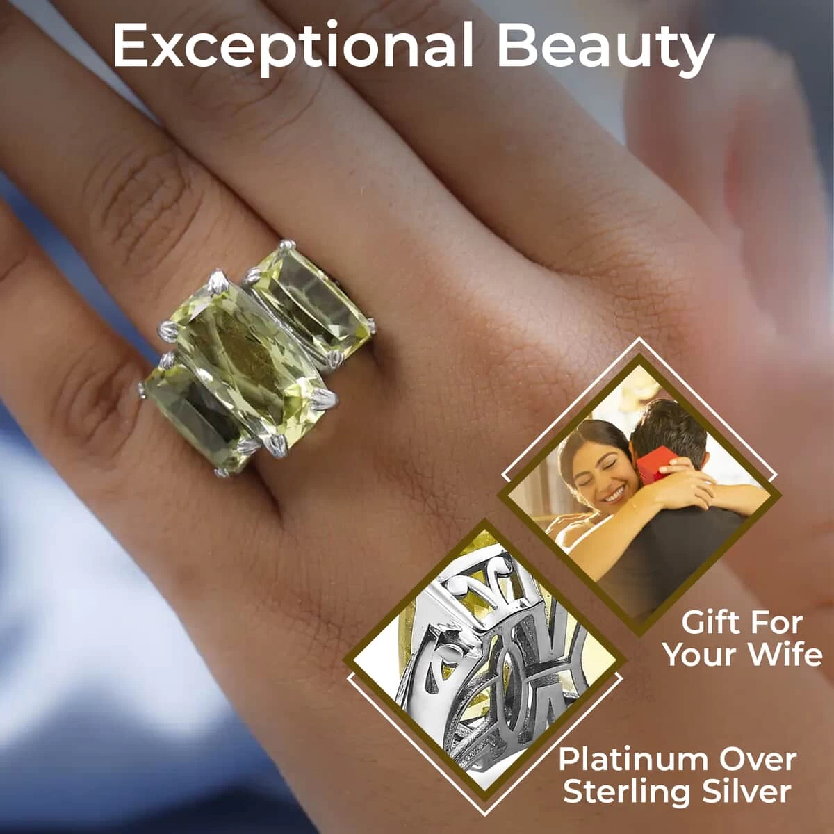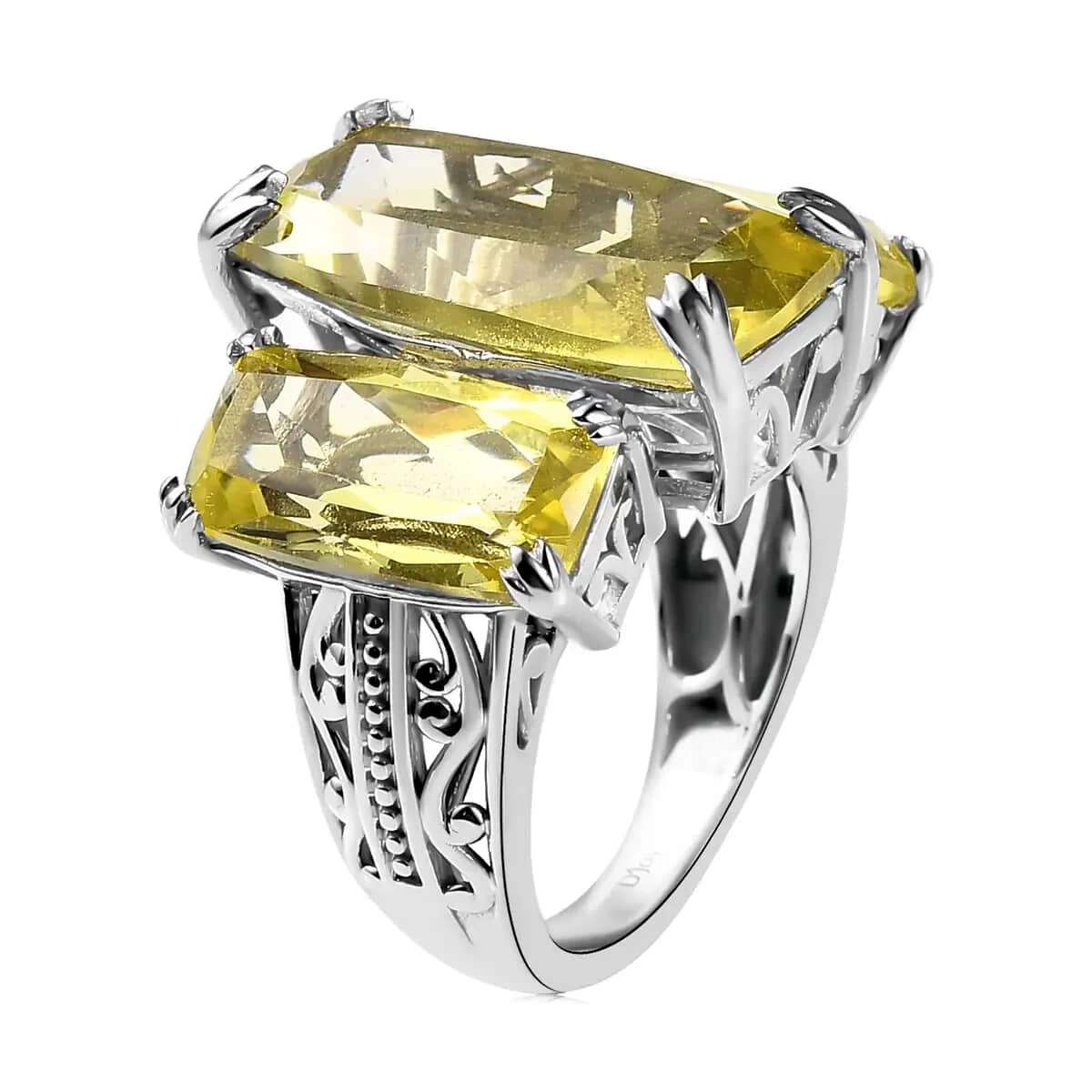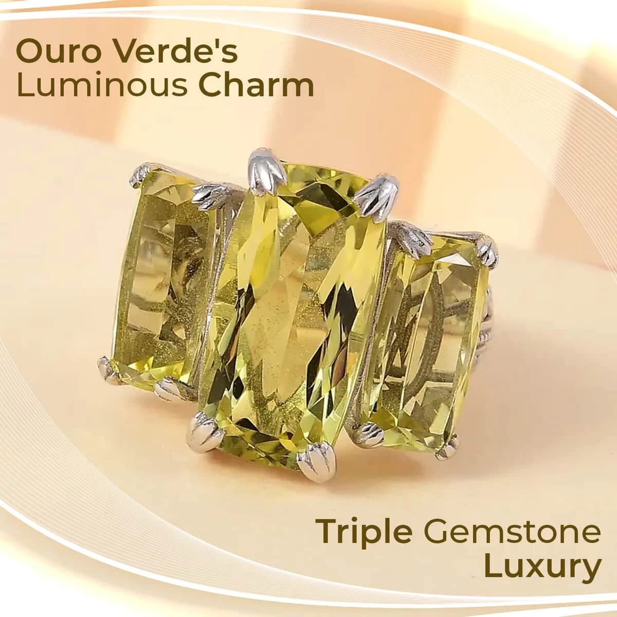 - GEMSTONE DETAILS: This three-stone engagement ring displays three quartz stones in the center. These green stones are held perfectly in a fancy prong setting. The center stone of this ring is carefully selected and cut to maximize its brilliance and color