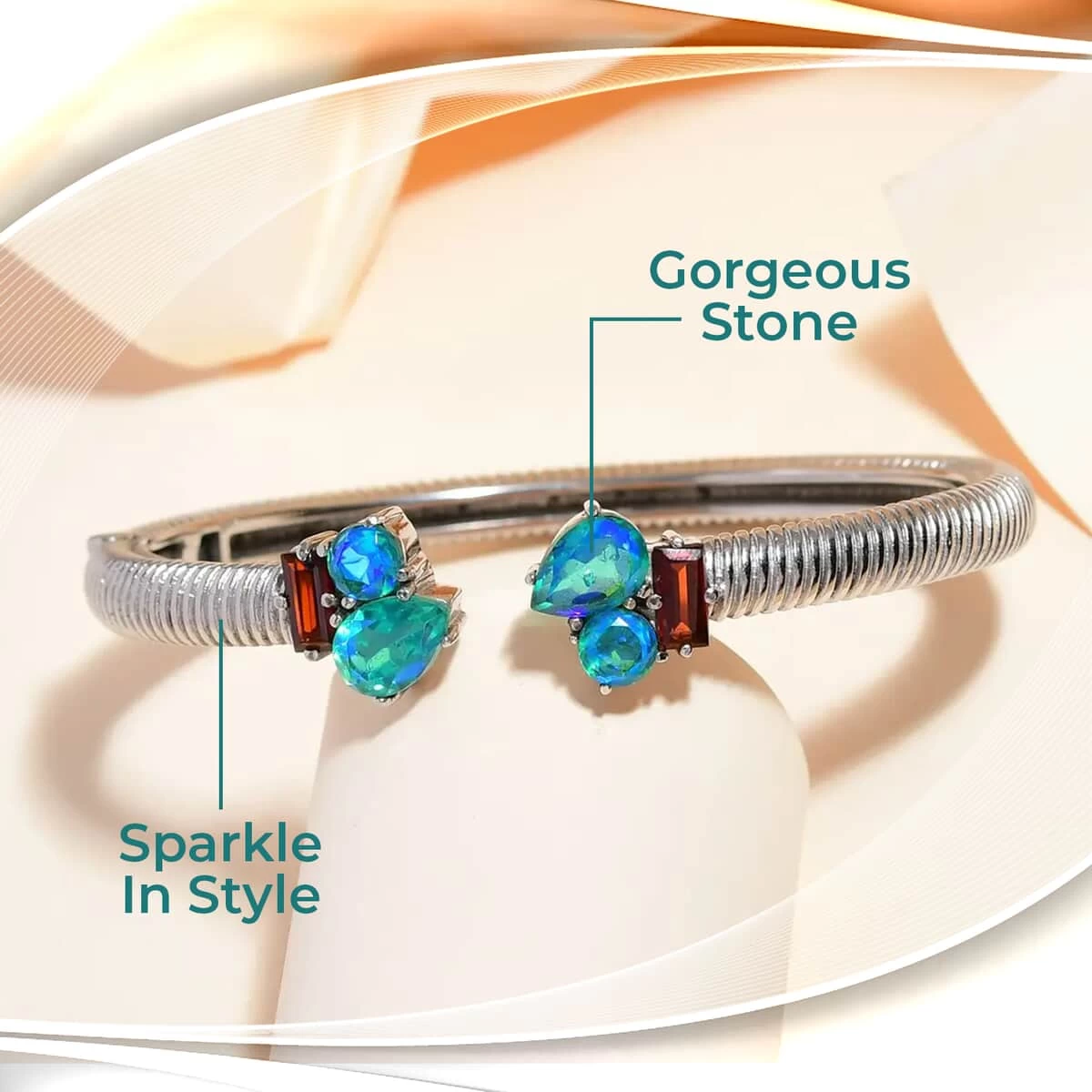 - EXQUISITE CRAFTSMANSHIP: At its heart lies pear-shaped and round-shaped peacock quartz, its unique silhouette capturing the depth and myriad of colors inherent to this striking stone. Anchoring the tarnish-free stainless-steel bracelet at each end, the octagon-shaped Mozambique garnet stands as a testament to precision and clarity, its edges and facets beautifully showcasing the gem’s deep hue