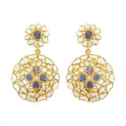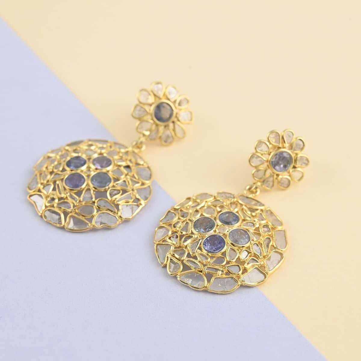 Embrace the vibrant radiance of these polki diamond and gemstone round flower earrings. A magnificent medley of hand-selected polki diamonds and vibrant gemstones form a striking floral motif, evoking a sense of romance and enchantment. This striking pair masterfully embodies the beauty of nature while adding a glamorous touch to any ensemble.